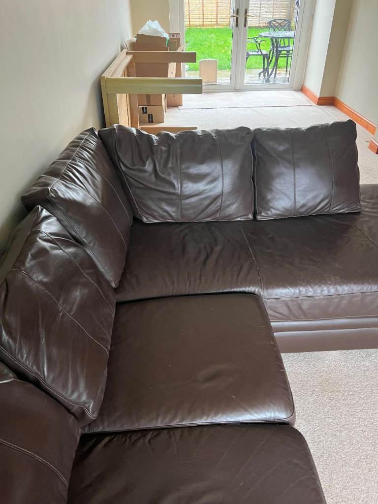 Brown faux leather corner sofa. Second hand with surface scratches, no tears. Very comfortable. Collection only.