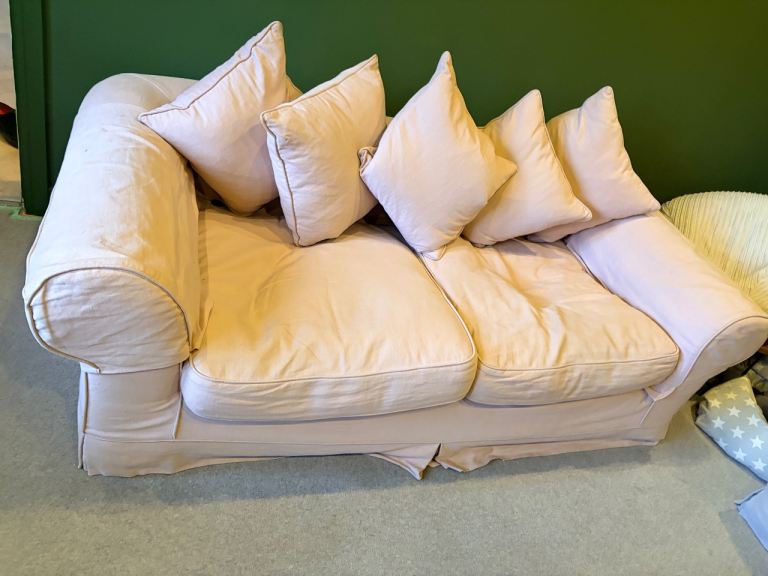Loose-covered three-seater sofa in pink with five back cushions, along with a matching loose-covered loveseat in grey. Both pieces are solid, high-quality furniture and extremely comfortable. Please note, they are very heavy and will require a van for transport.