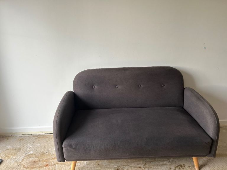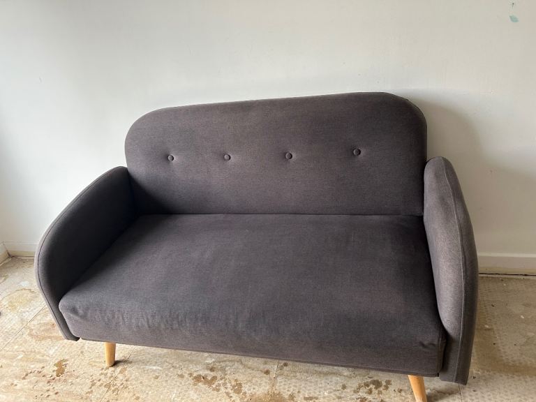 2 seater fabric charcoal grey sofa with wooden feet.