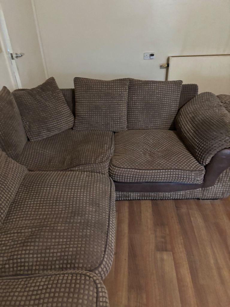 Free for collection large brown corner sofa and chair could do with the cushion covers going through wash no rips or tears one cushion does sag a little for collection only after 26th December
