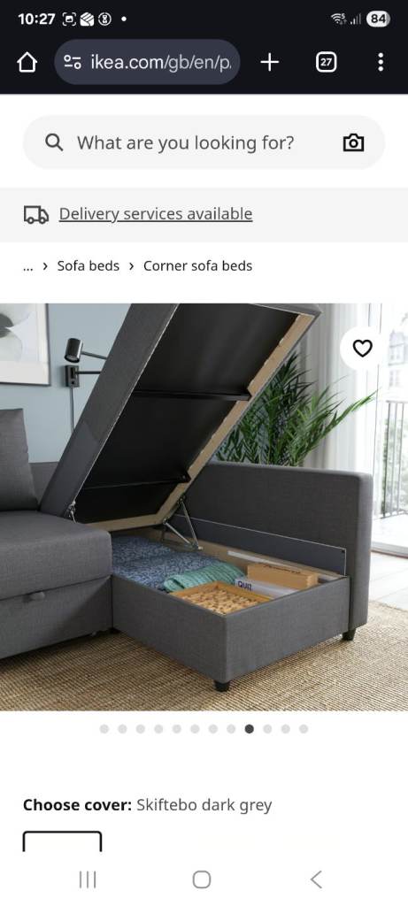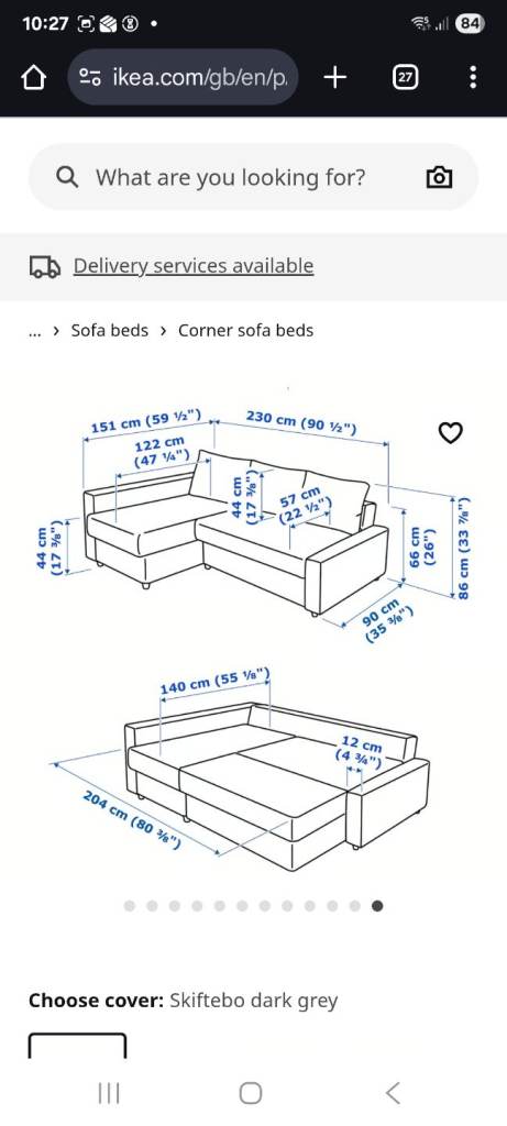 Grey sofa. Can be left hand or right hand. Pictures are from Ikea website. It is dismantled ready for collection. Good condition. Smoke free home. Fits in a large car, small van.