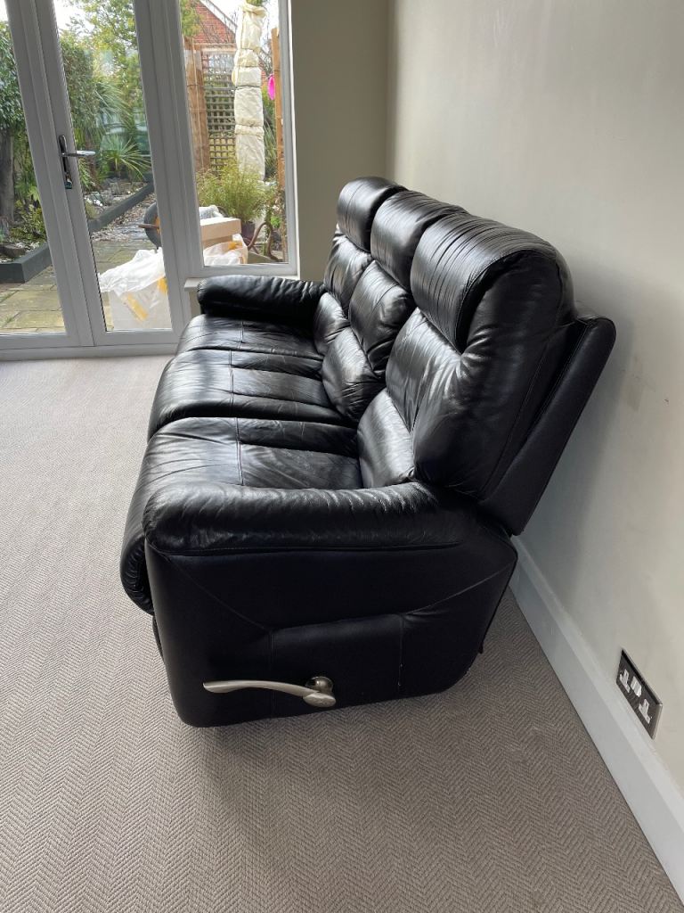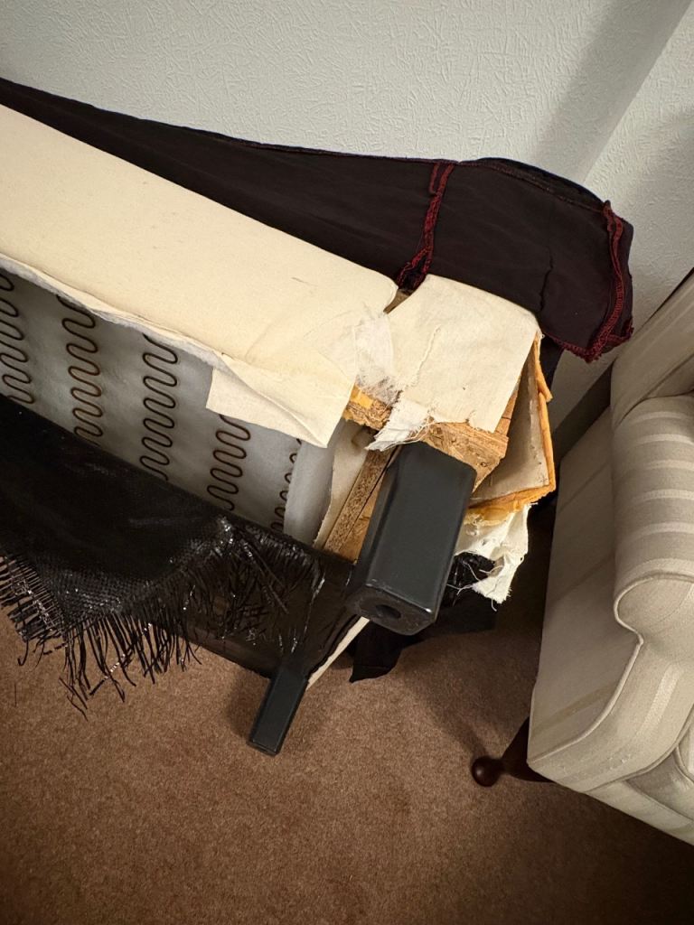 i bought this sofa from a charity shop a few years ago and i no longer need it. i think the sofa was red when it was first bought new and then dyed black (can still see some red stitching but this does look kinda cool). it’s a perfectly functioning, comfortable sofa - but as you can see from the pictures it’s pretty beaten up in places. the cover on the sofa can be fully removed, it’s corduroy fabric.