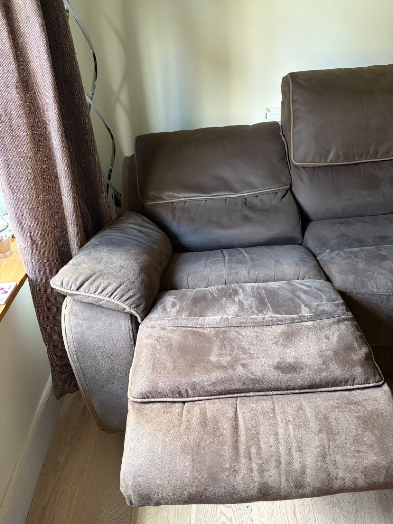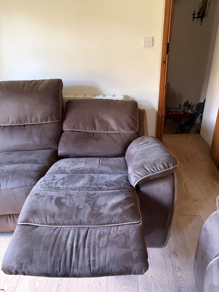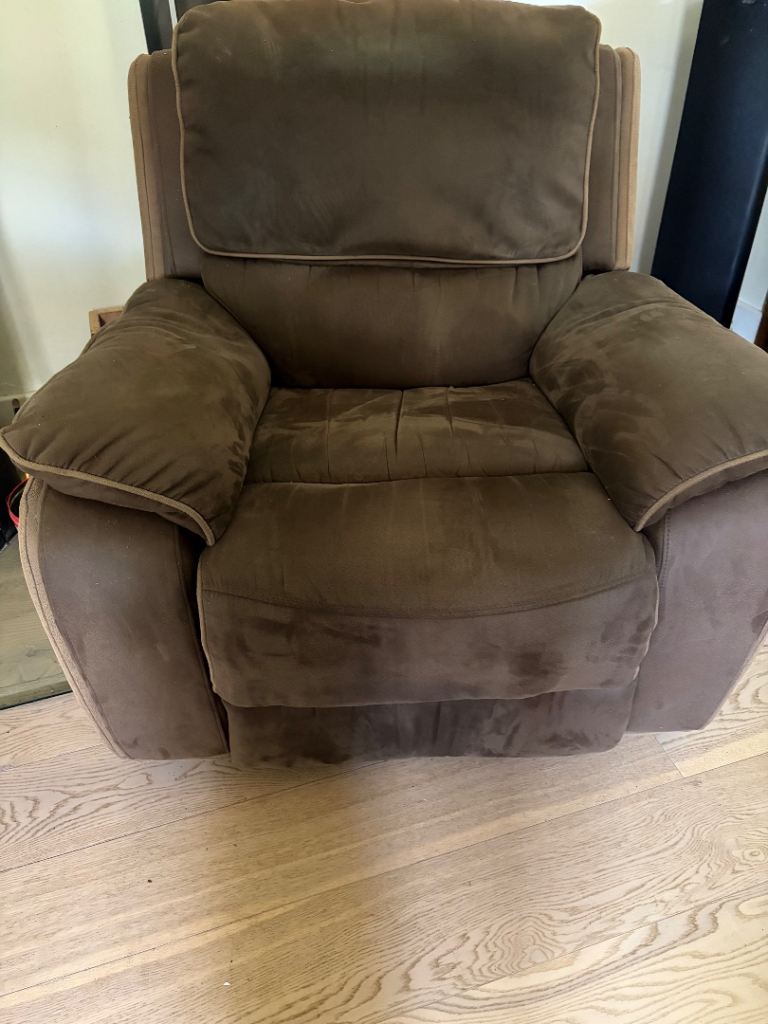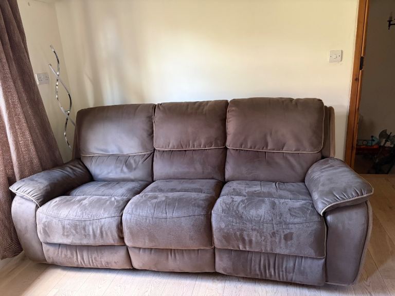Giving away a brown fabric sofa and two matching armchairs, all with electric recliner functions.