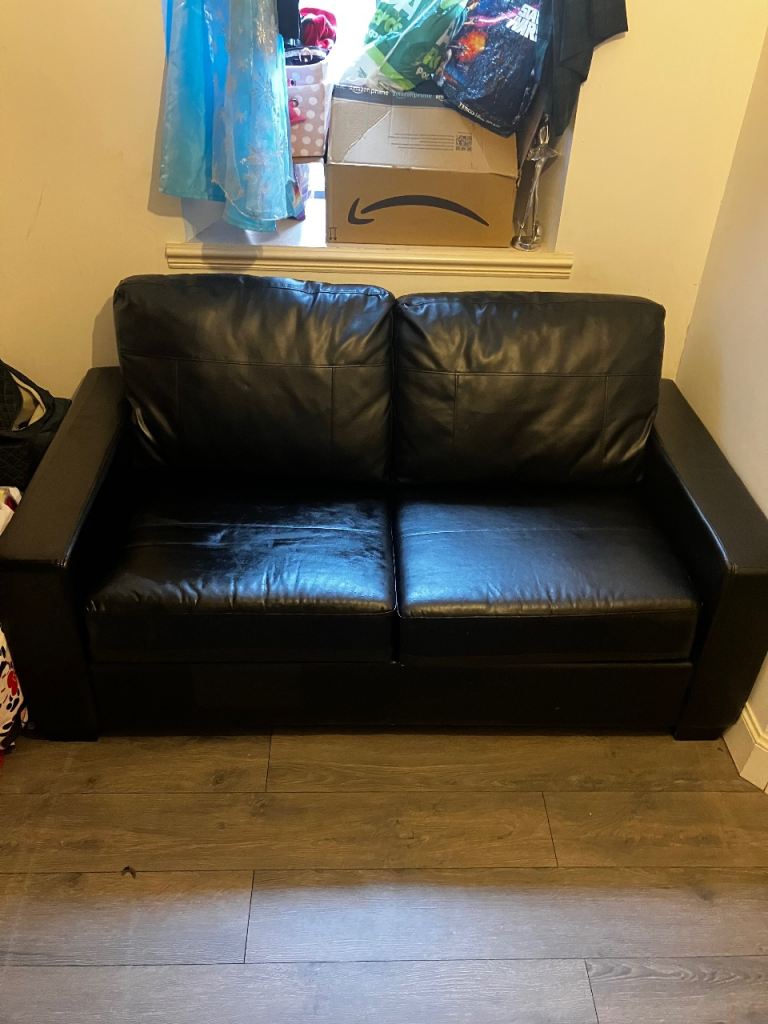 Black leather and PVC (mix) Sofa, Used but still fit for purpose. I need the space or I would keep it. The sofa was a tight fit to get out so would need someone who knows about removals to move it. Im unable to move it on my own so you would need 2 people to collect it from my downstairs lounge