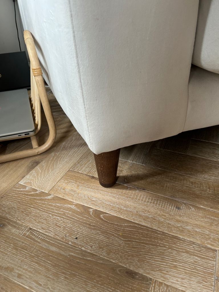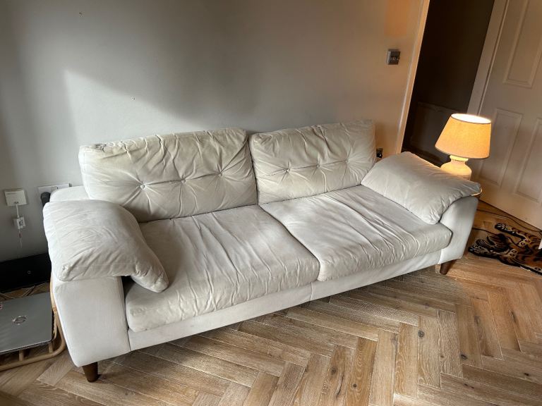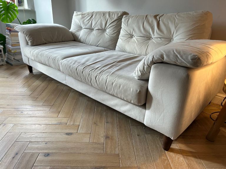 Stone, beige, off white colour velvet sofa. 2 seater from Darlings of Chelsea.