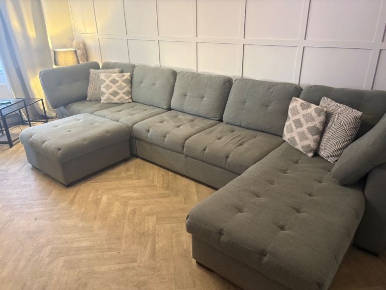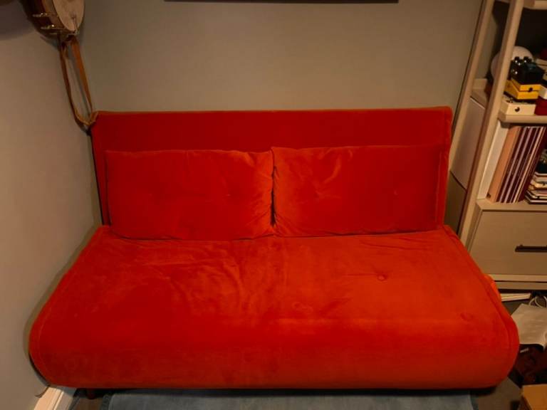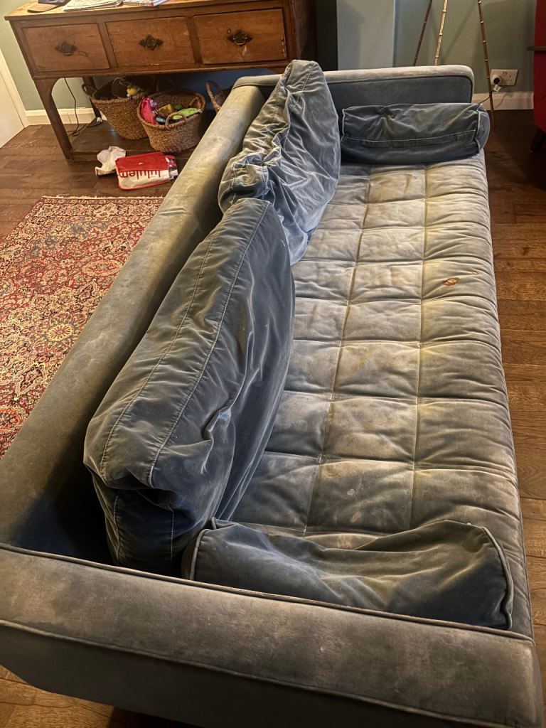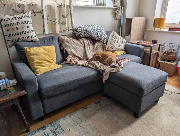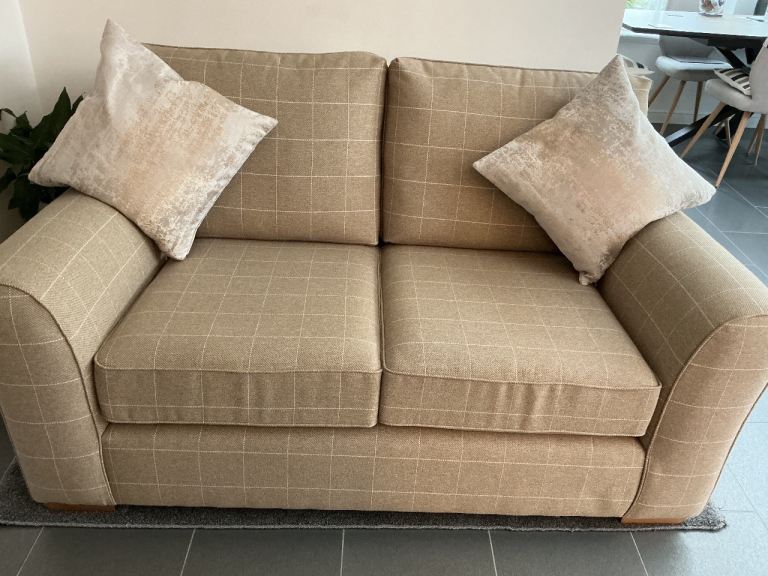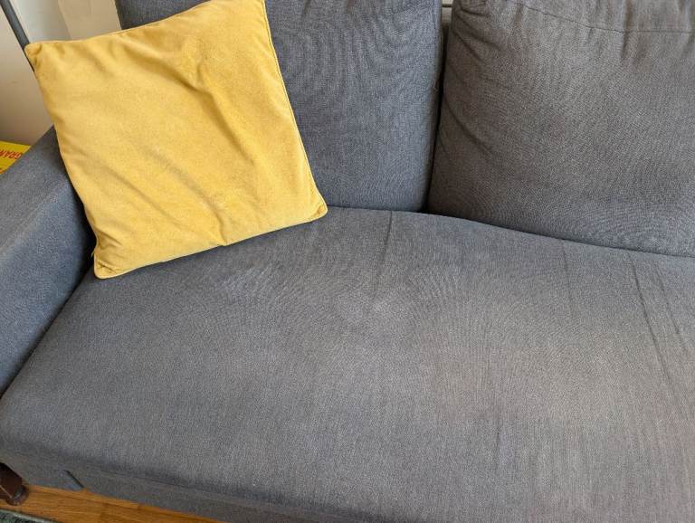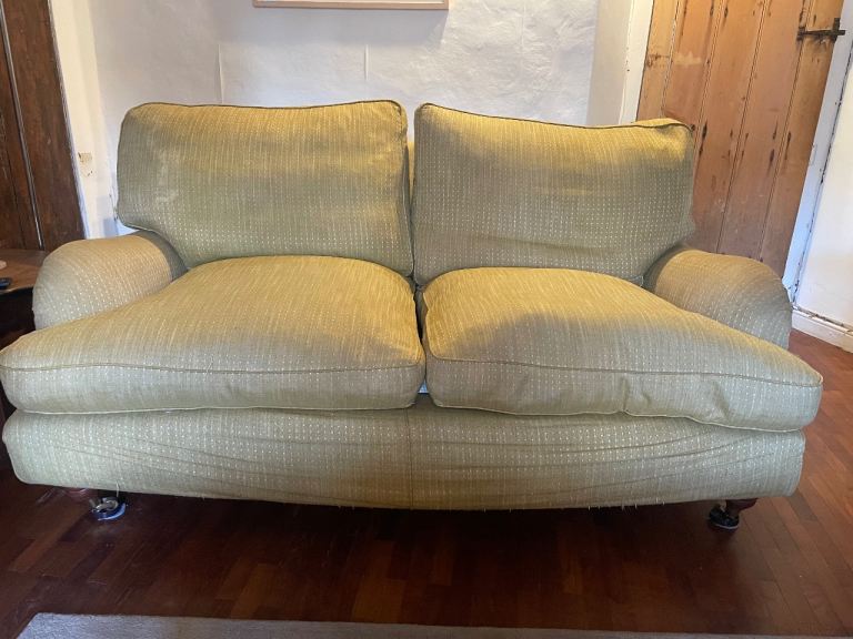 This sofa is approx 6ft wide - good for a small space. Full disclosure: it comes from a dog home. So there are some signs of doggy licks and naps on the upholstery. But it should be in good shape after a shampoo or with a cover. And it doesn't smell like a dog!