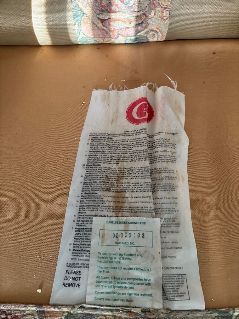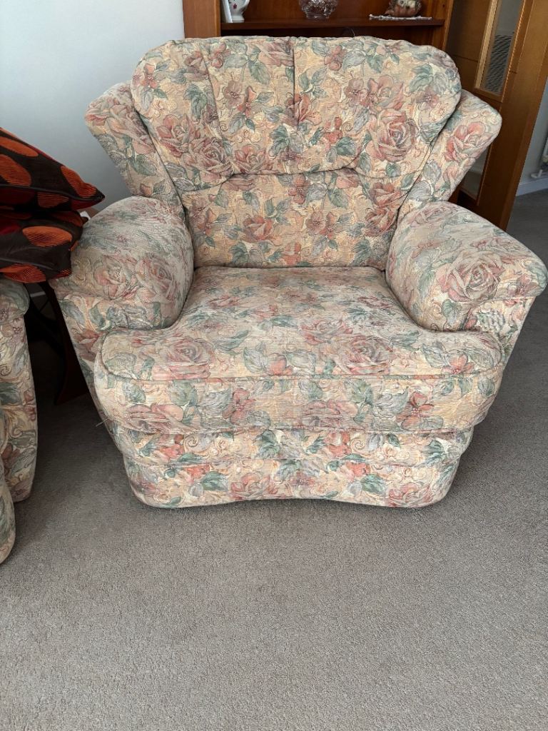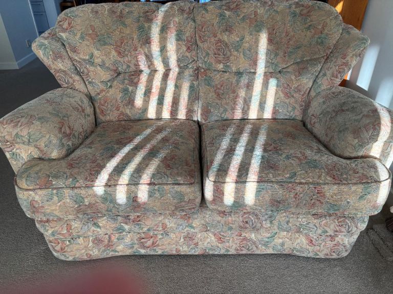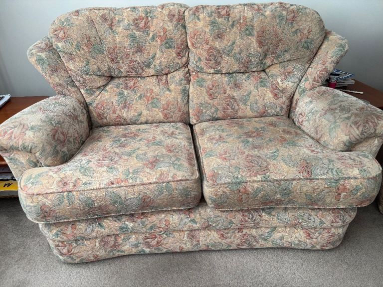 Two two-seater sofas and one armchair. G Plan. Several years family use. In fairly good condition. Floral fabric cover, some staining under cushions. Fire safety compliant.