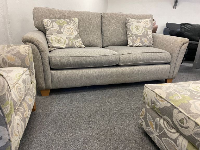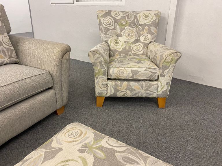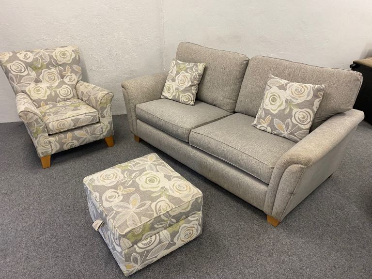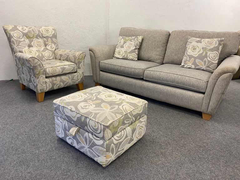 Oatmeal fabric and floral match sofa set with matching storage footstool.