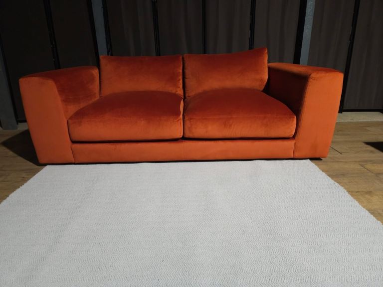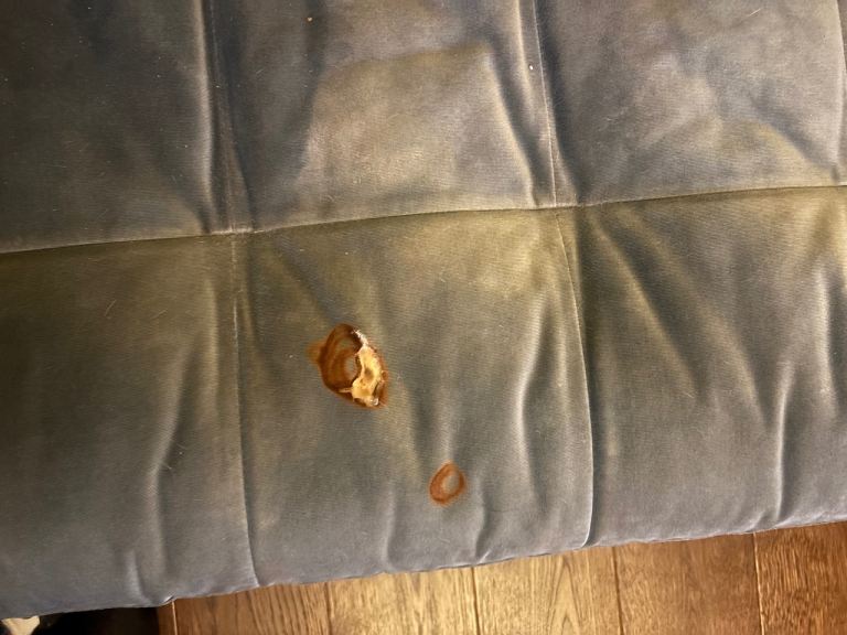 It has some noticeable wear, including a burn mark on one cushion and some marks.