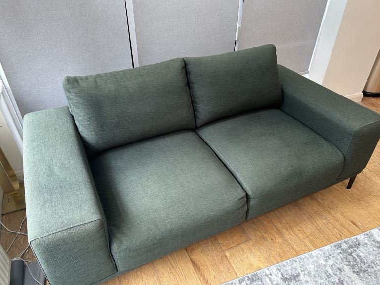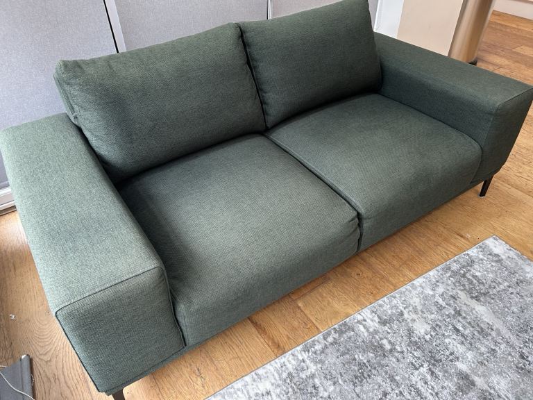 Comfortable green sofa originally from Made. Minimalist design with deep cushions and wide armrests.