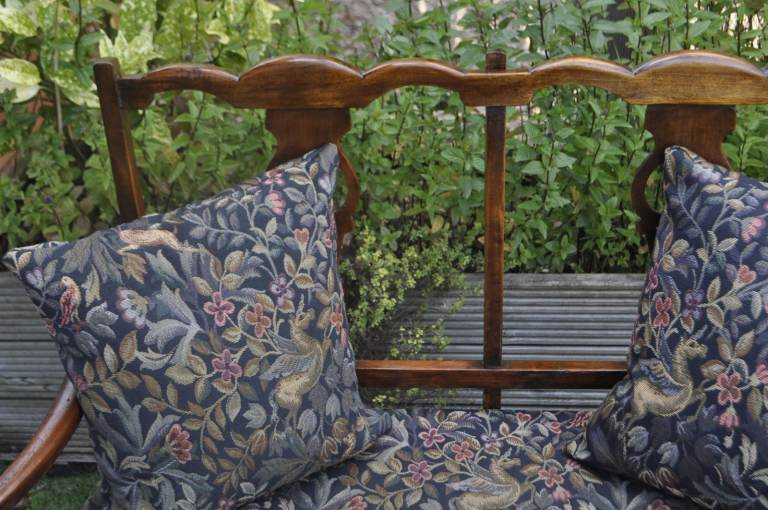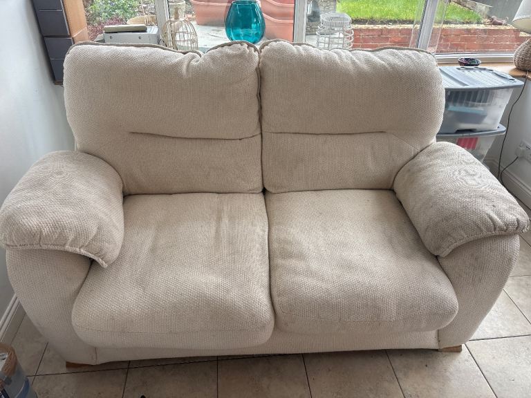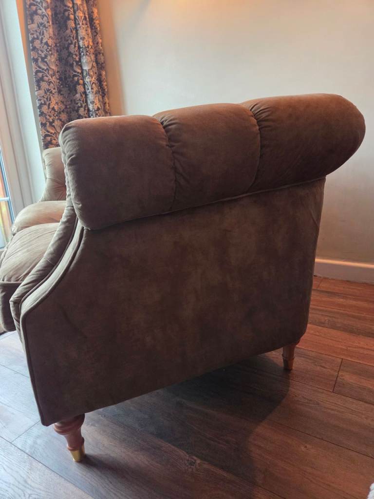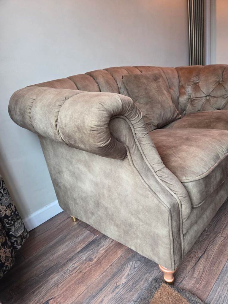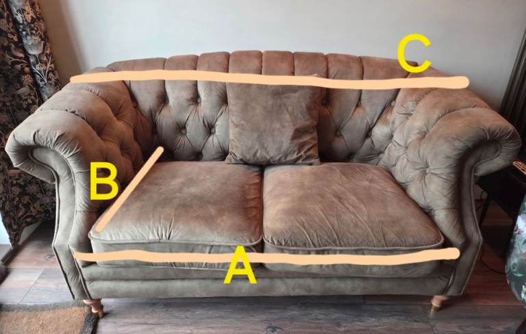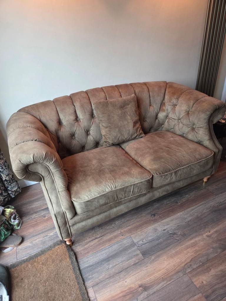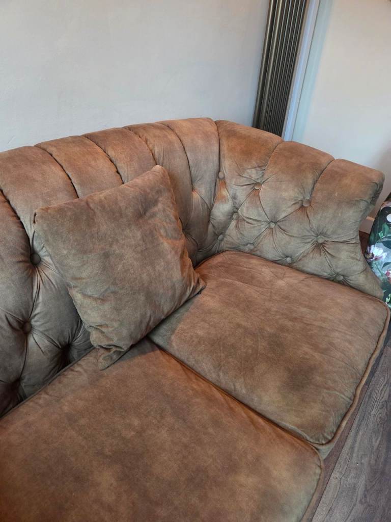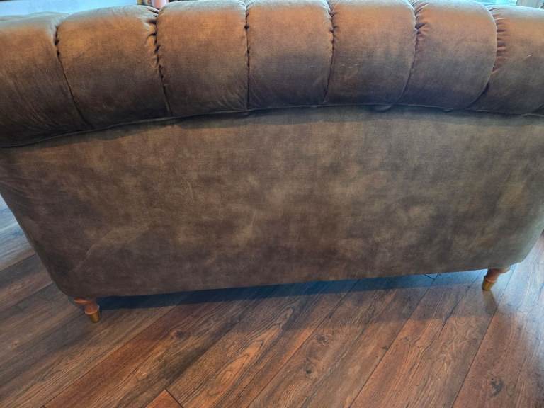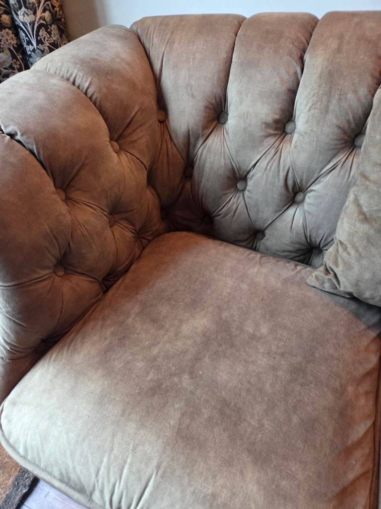 Dusky, mottled Green colour. Velour type material. Buttoned back, chesterfield style. good condition. Move forces sale. Colour slightly deeper and brighter than pics show. See last 2 pics for sizes. A:115cm B:61cm C:165cm D:90cm E: 78-82cm (curved back)
