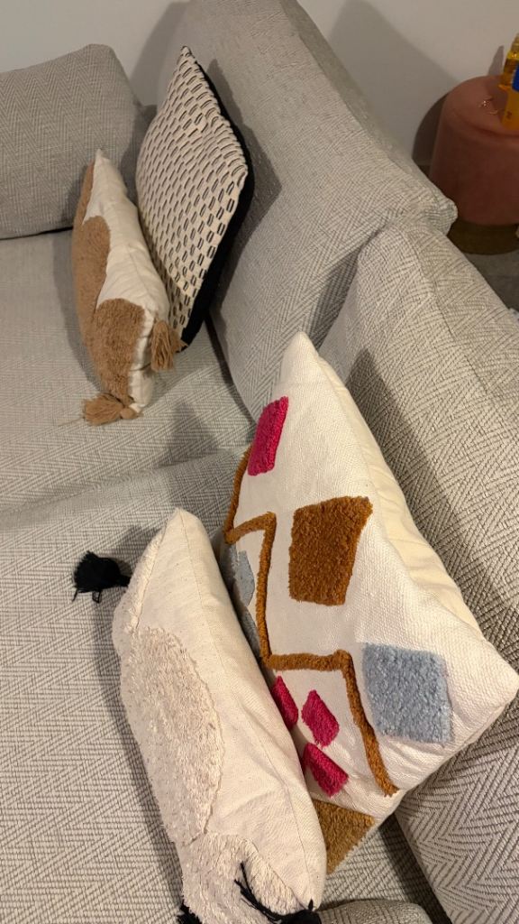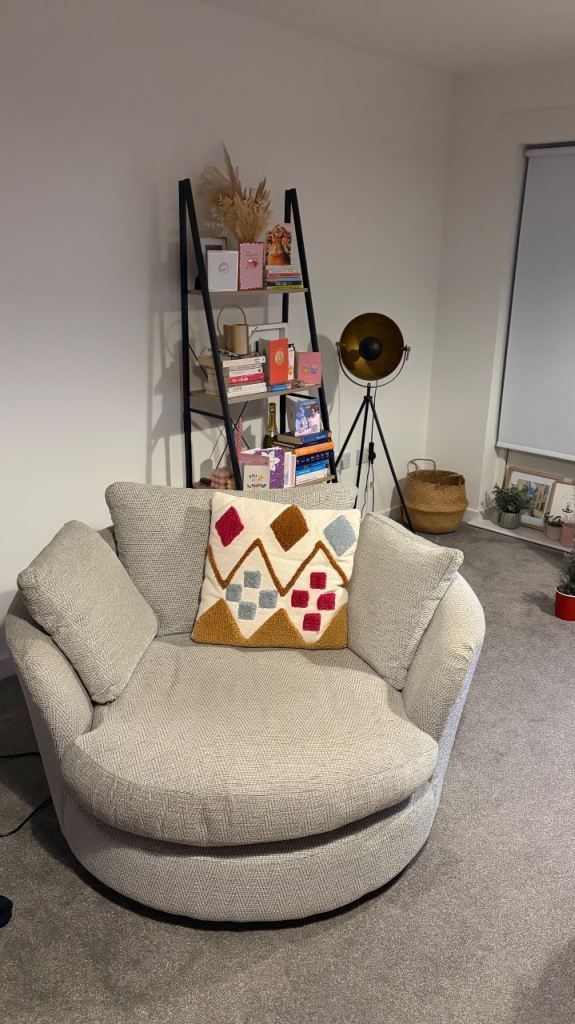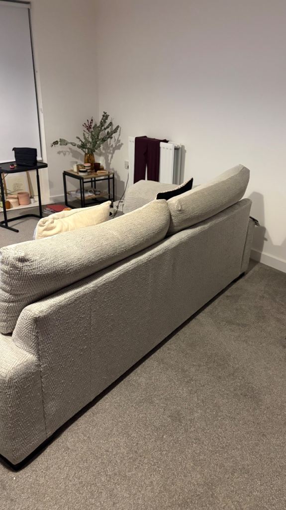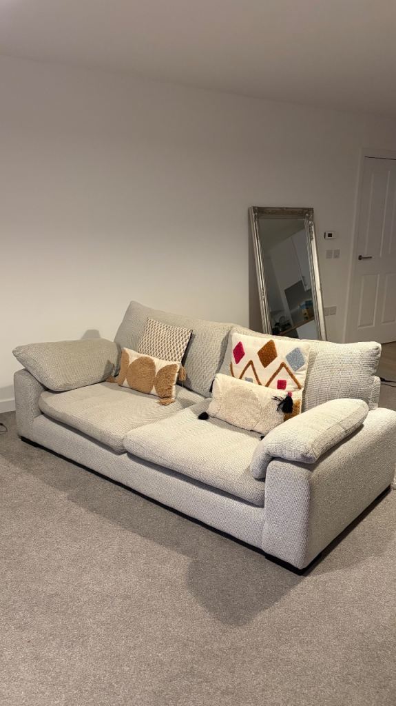 Lovely matching DFS 3 seater sofa and cuddle chair. So comfy! Cuddle chair barely used! 4 cushions included. Pick up only, need removed by 18th February. Slight rip in the right arm sofa cushion, see in last pic - just needs sown.