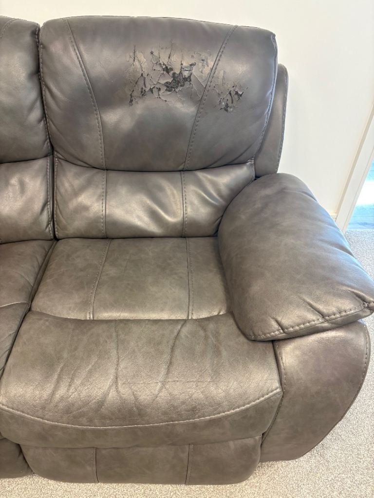 Good condition overall except for one end seat on the corner sofa which has noticeable wear and tear on the backrest (see photo).