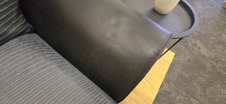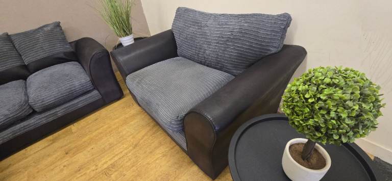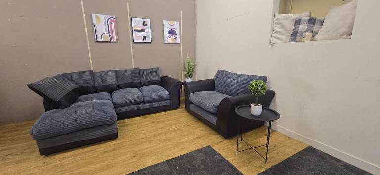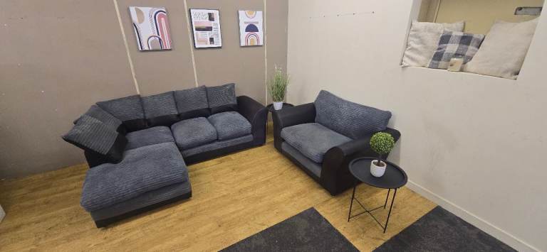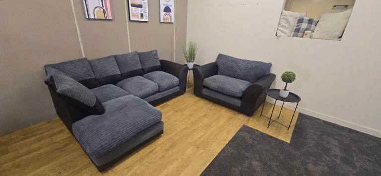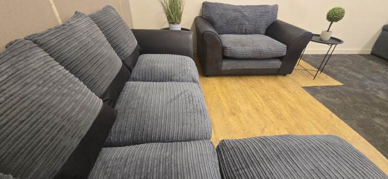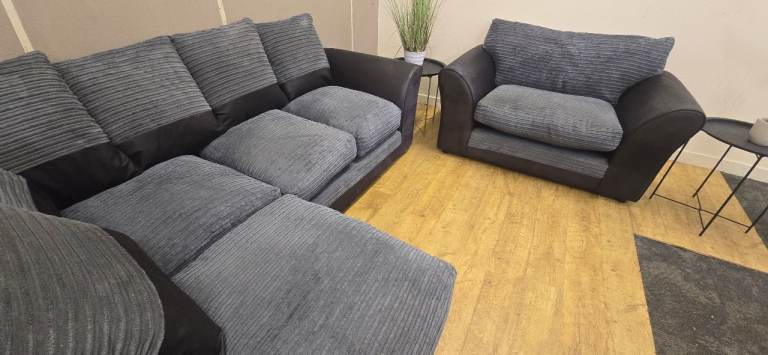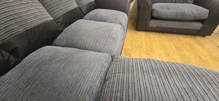 GREY JUMBO CORD CORNER SOFA AND CUDDLE CHAIR DELIVERY AVAILABLE