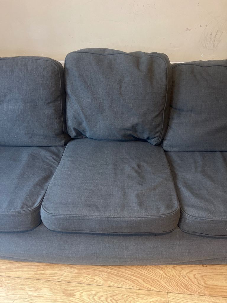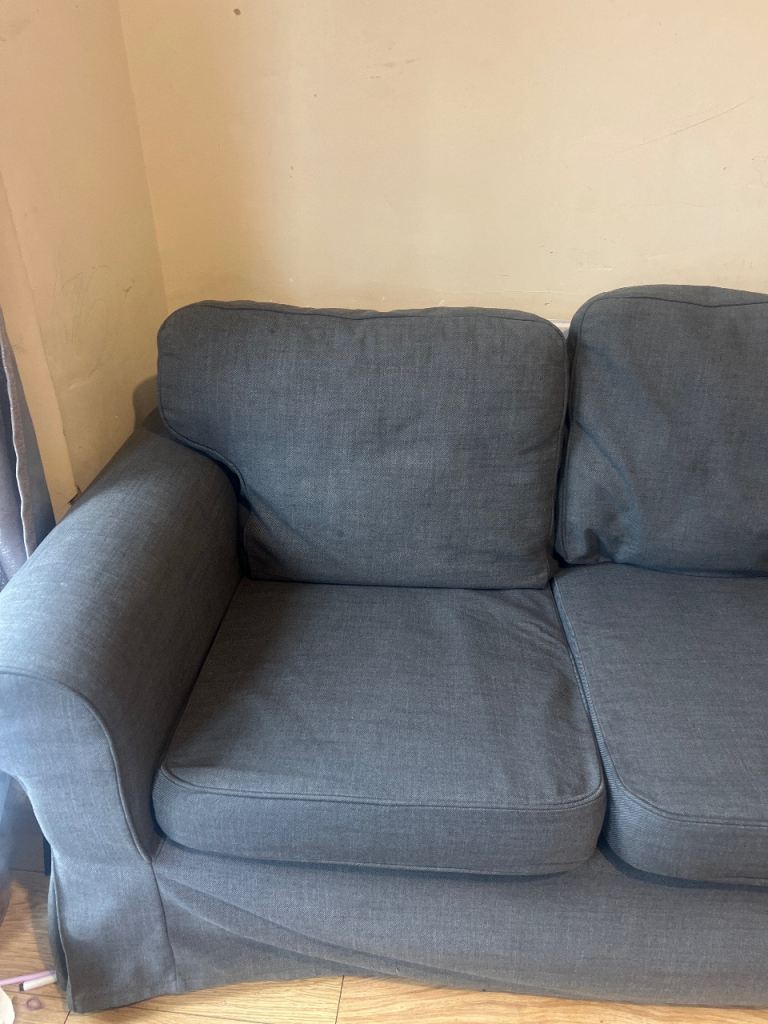 Grey three seater large sofa for living room. Need to person to carry it. All covers are washable.