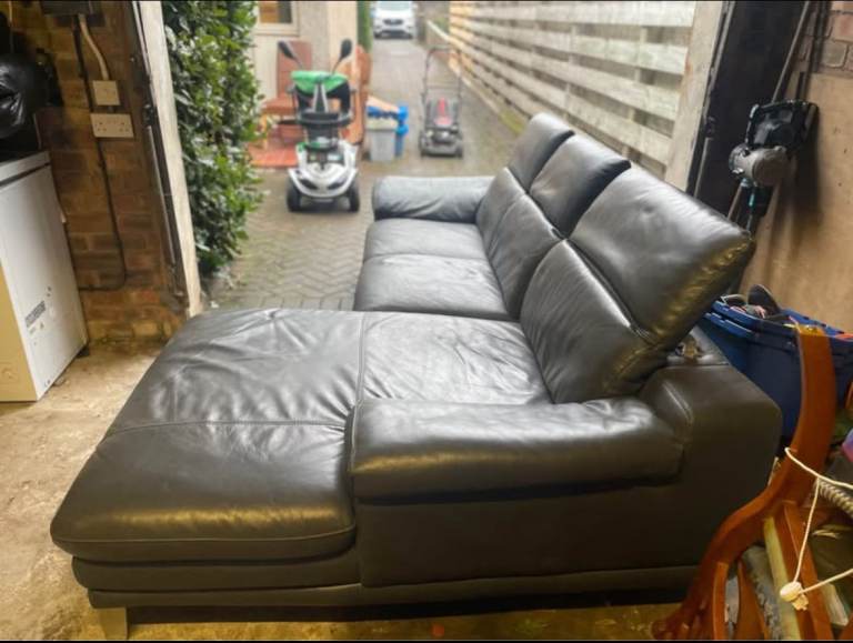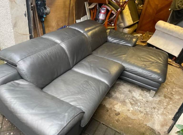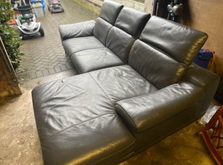 Posting for 9+ monthsGrey Leather L-Shape Sofa with Adjustable Headrests. DELIVERY AVAILABLE
