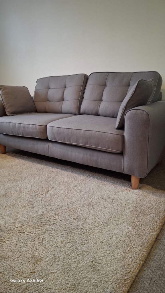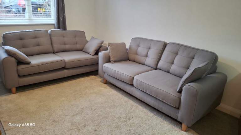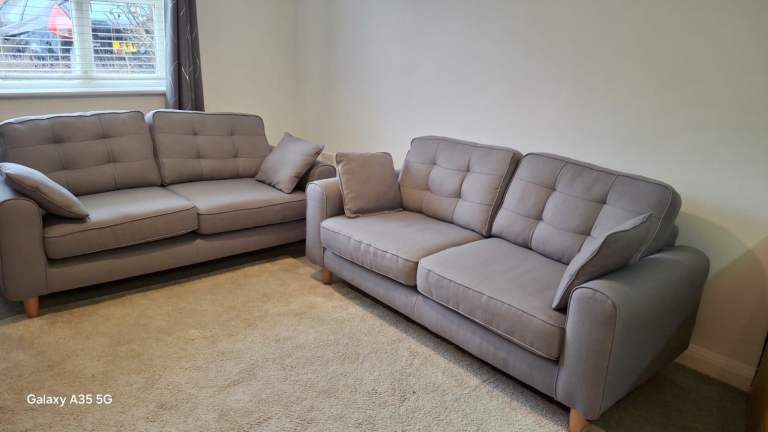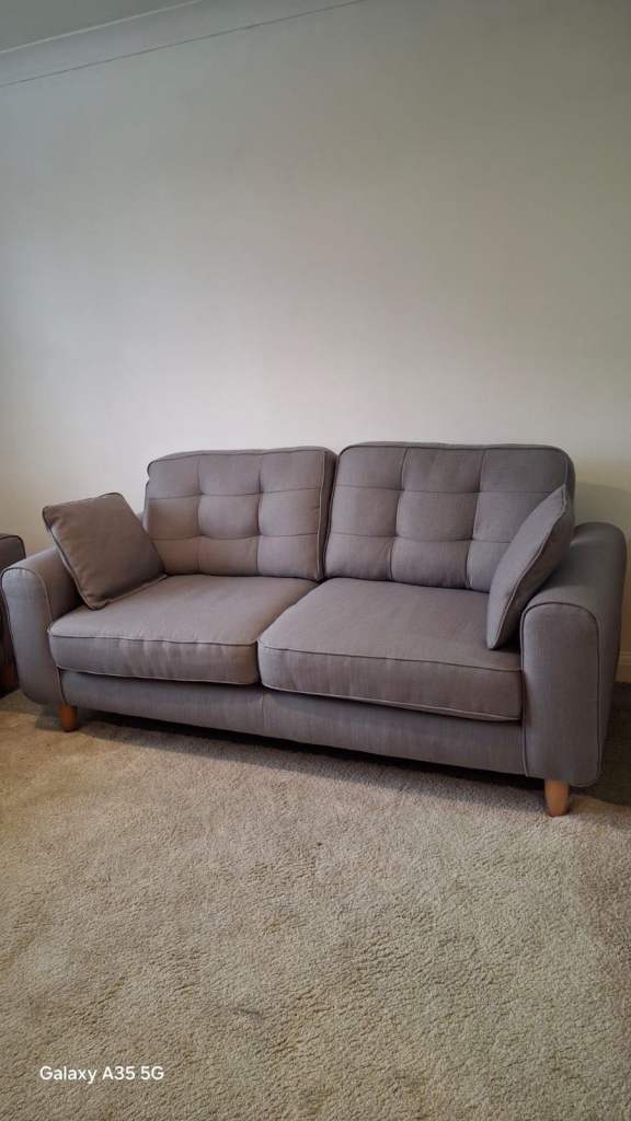 Grey fabric sofa set in good condition. Modern design with soft upholstered finish, tufted back cushions, and rounded armrests. The set includes a three-seater and a two-seater sofa, both with sturdy wooden legs. Comfortable, clean, and well-maintained, suitable for a living room or lounge space. Comes with matching cushions.