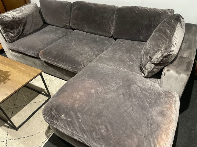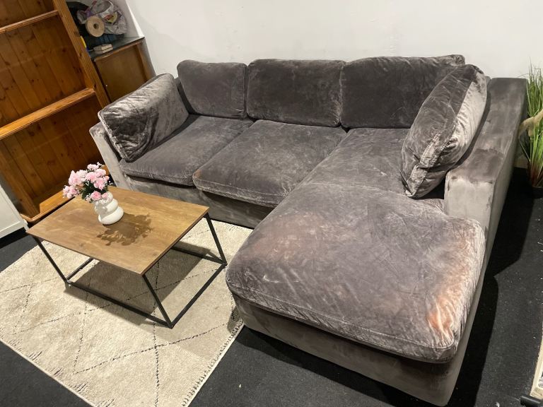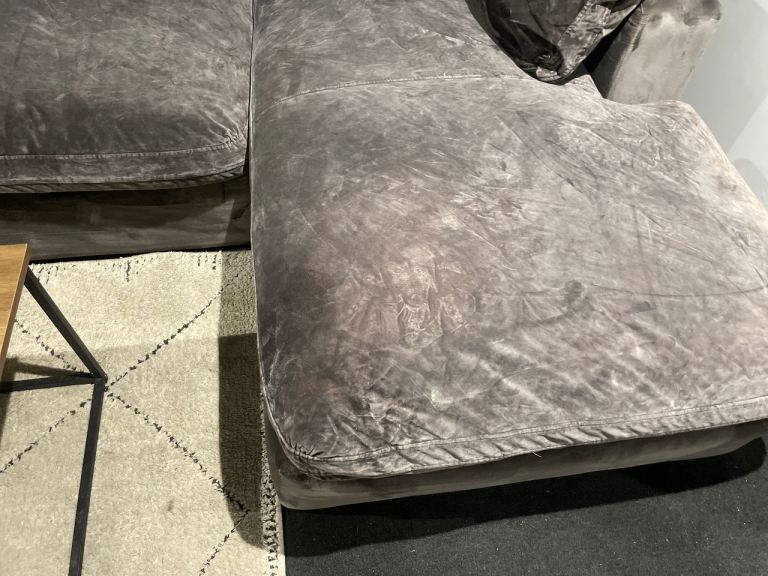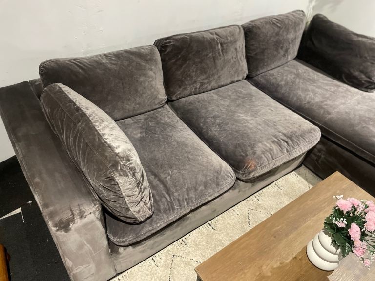 Grey suede L Shape Sofa for sale, few marks as can be seen in pictures and age related wear but very sturdy and very comfortable. Comes in two parts, can send a video for a closer look.