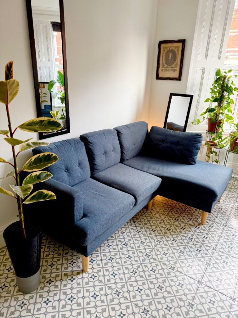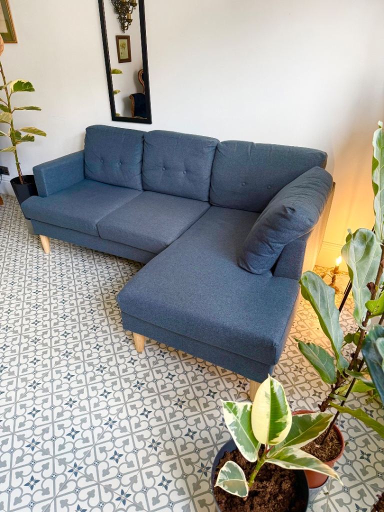 Beautifully comfy 3 seater Habitat blue sofa for sale, includes big and small cushions, buyer collects in Walton L4, move forces sale, a steal at £350, please txt / call Francis for further info