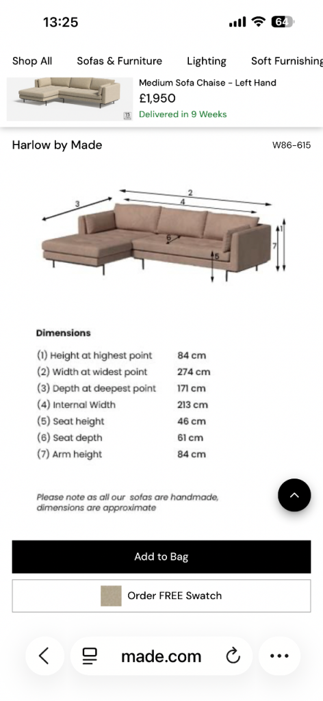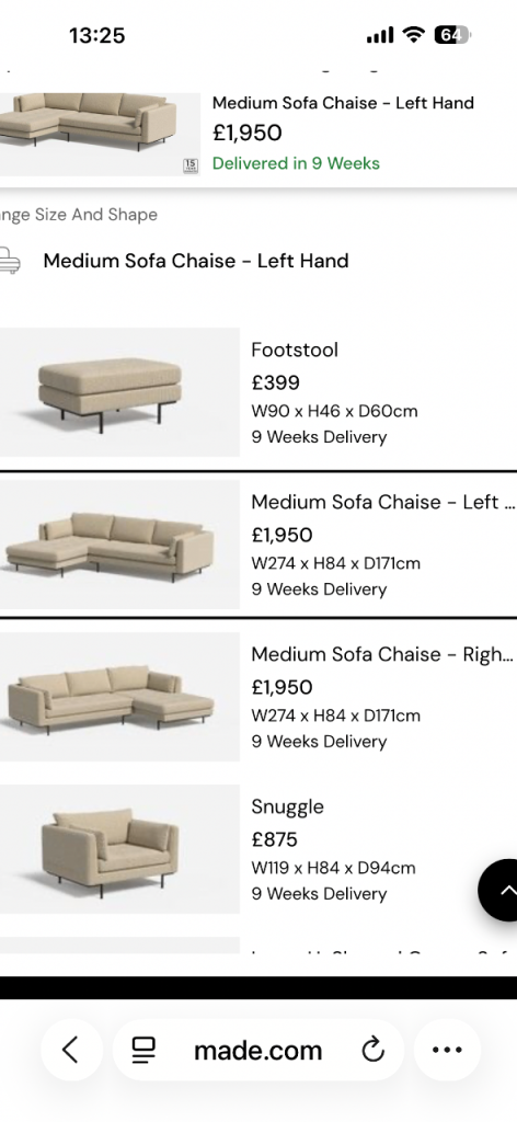 Doesn’t fit my new space. Left hand side corner chaise. Splits into two for alternative set up and easy moving.