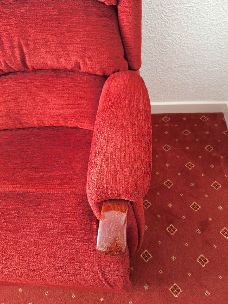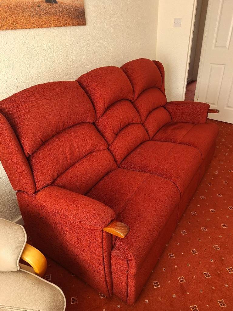 A comfy red fabric three-seater sofa, perfect for a living room.