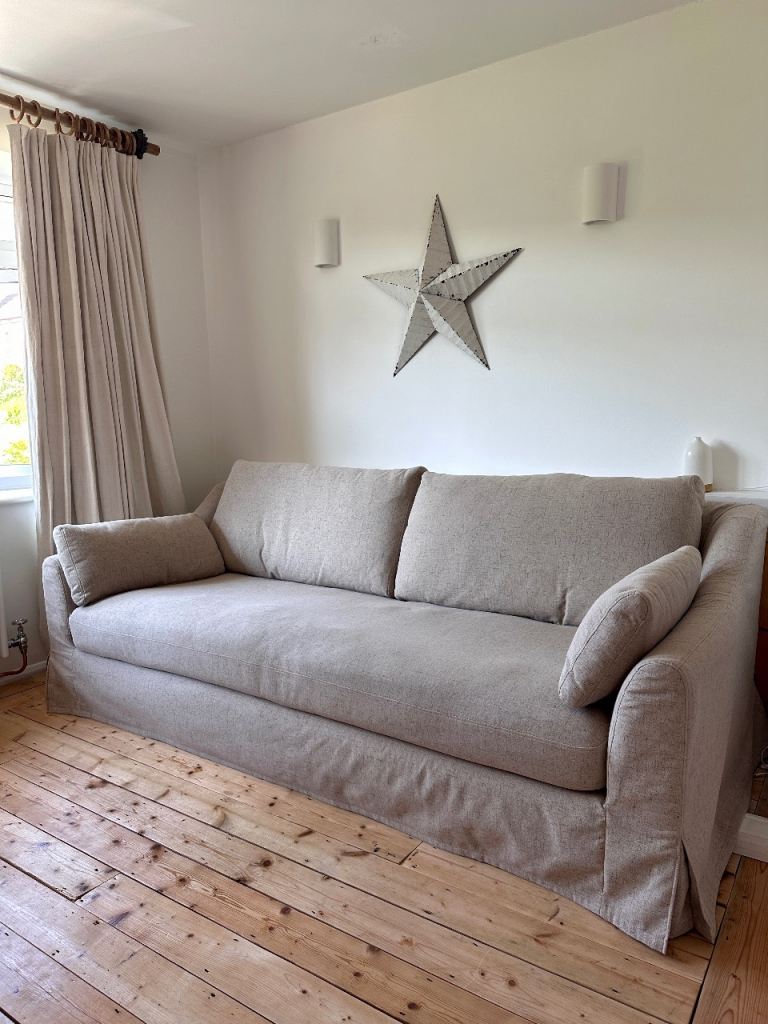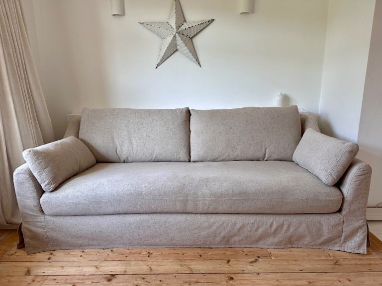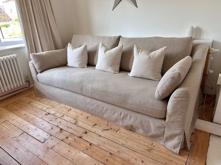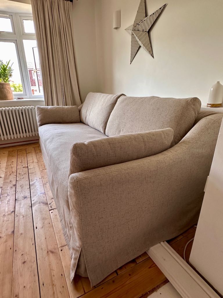 Fantastic condition, the now discontinued popular coveted Farlov sofa, with linen effect cover in fabulous beige colour. It is a “smart” fabric cover meaning water spills won’t soak in and super easy to wash and dry when you want to launder as all the covers are loose and can be removed.