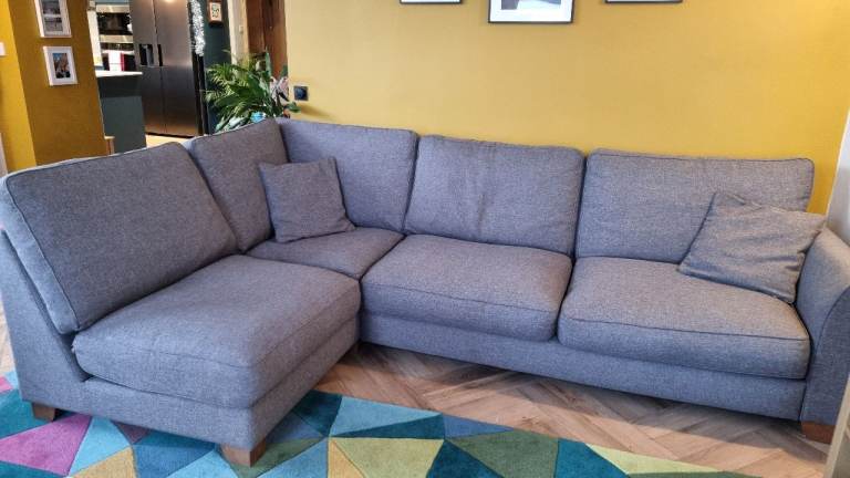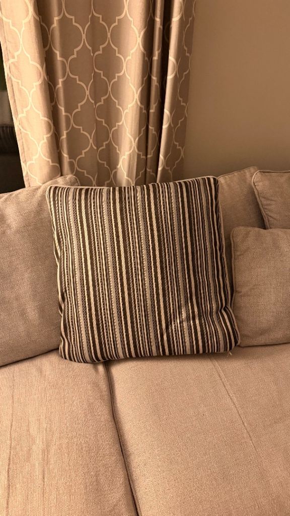 Comfortable L-shaped off-cream fabric sofa in great, clean condition. Comes with 4 two-way reversible cushions featuring a striped side, so you can change the look easily.
