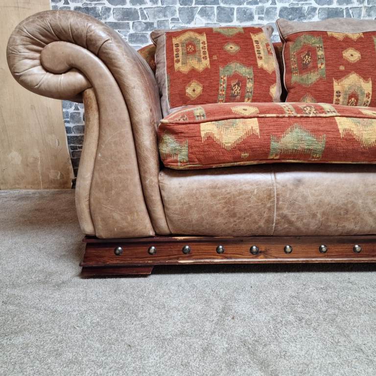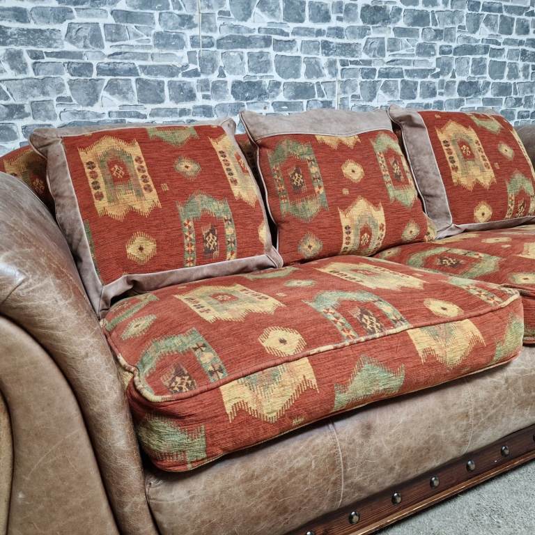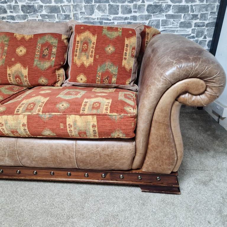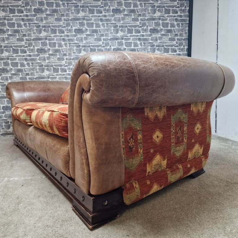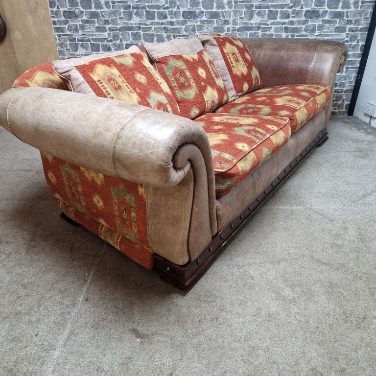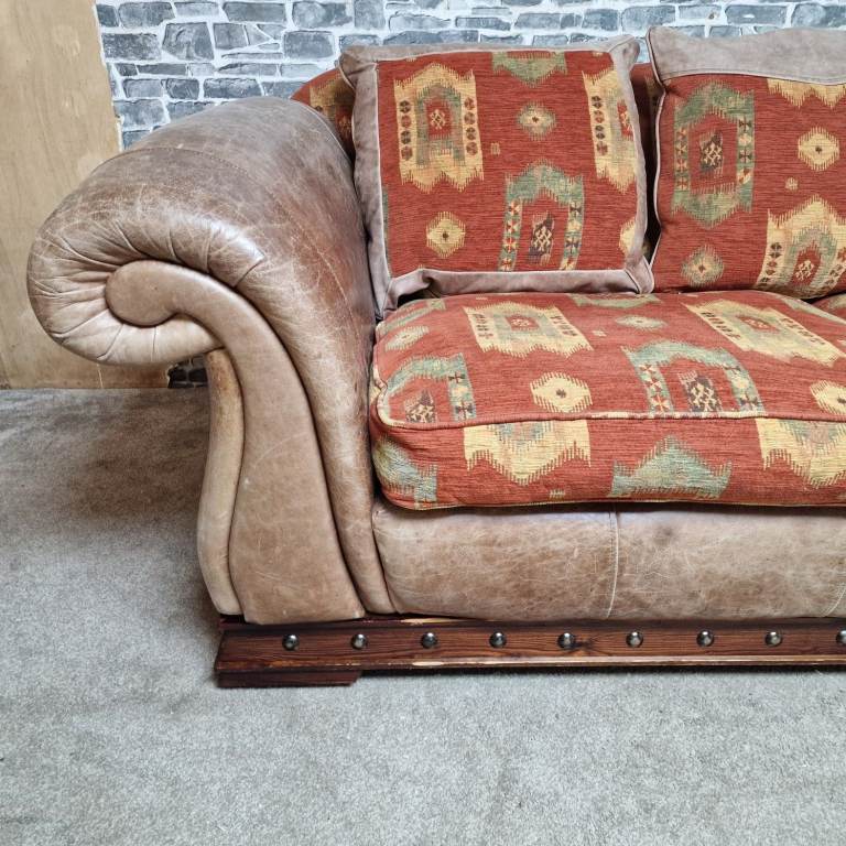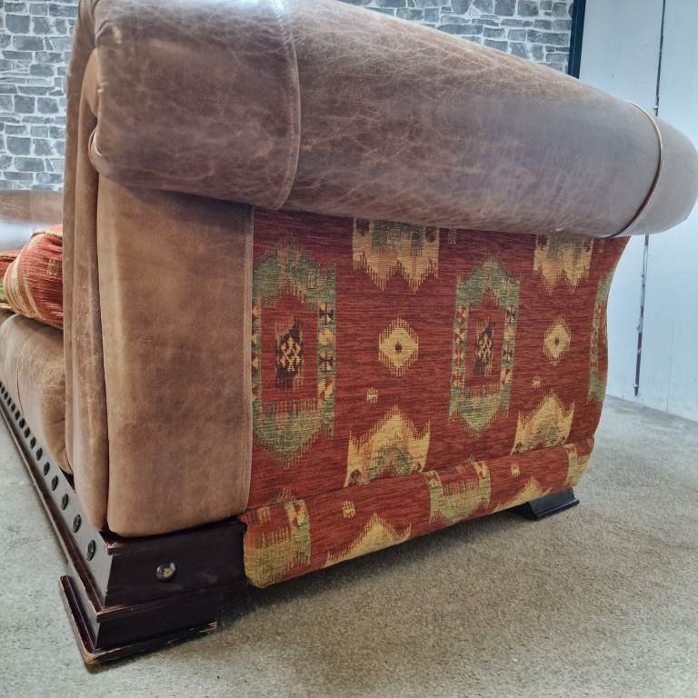A substantial and very comfortable large 3/4 seater sofa with a classic, chunky design. Upholstered in a combination of leather-effect sides and patterned fabric cushions, giving it a warm, rustic look that suits both traditional and eclectic interiors.