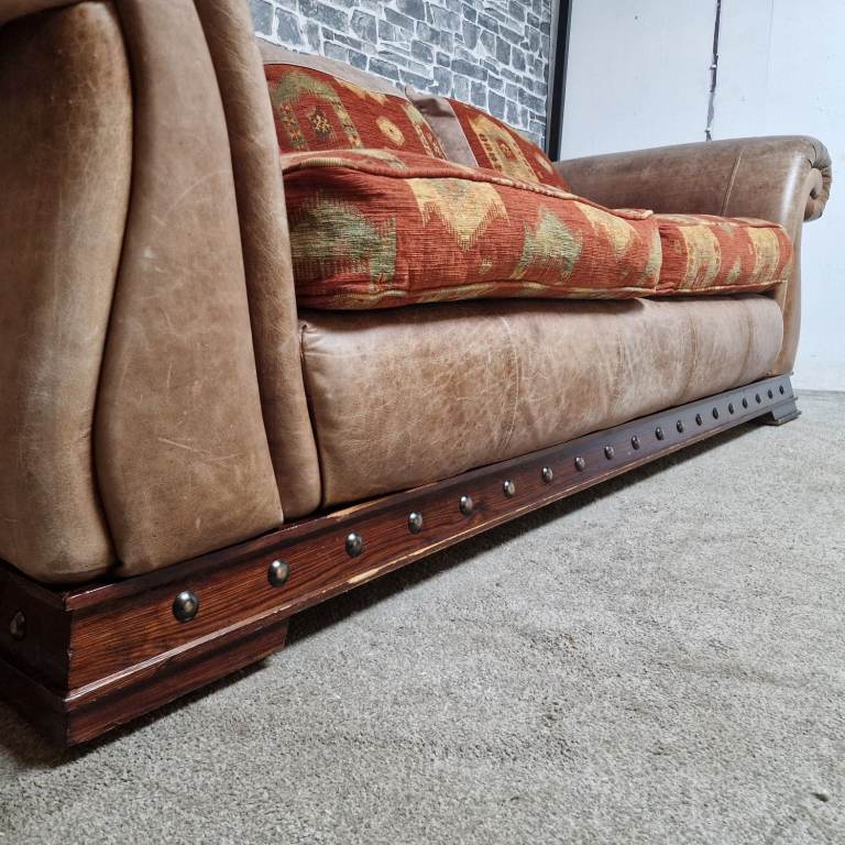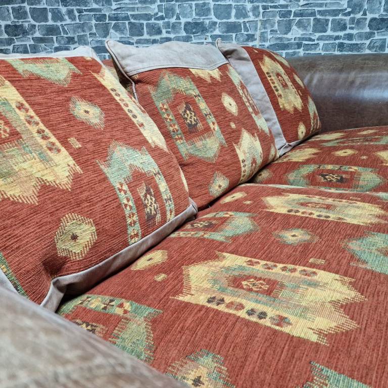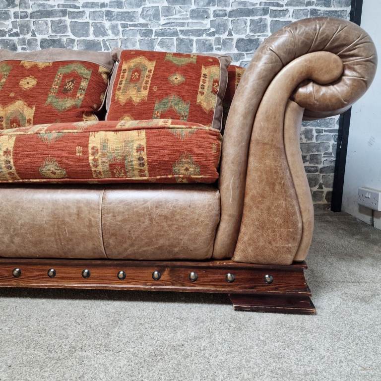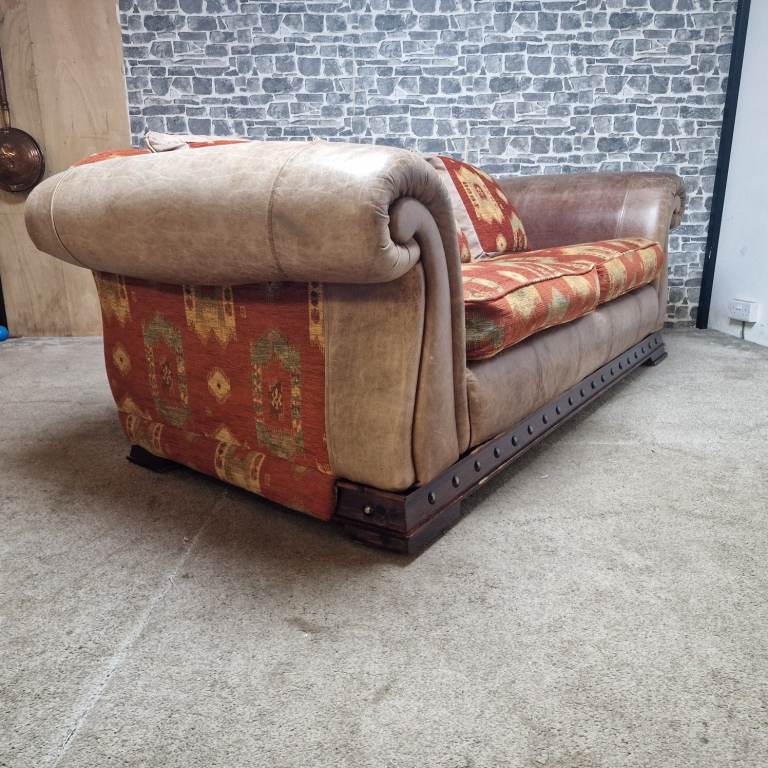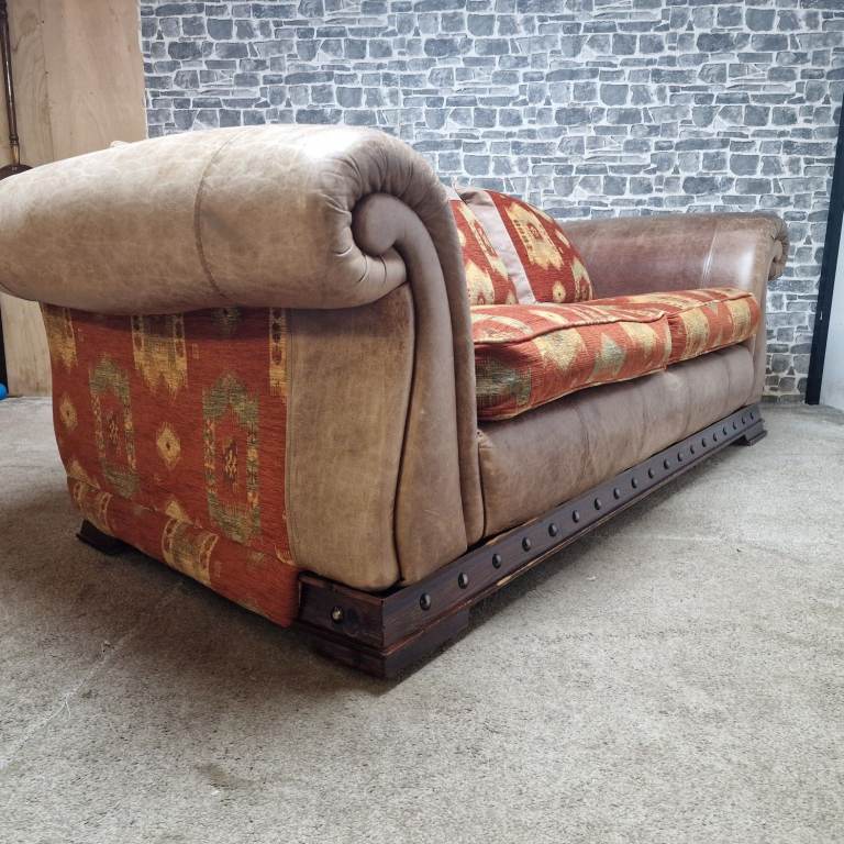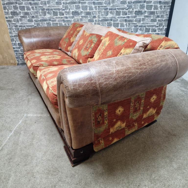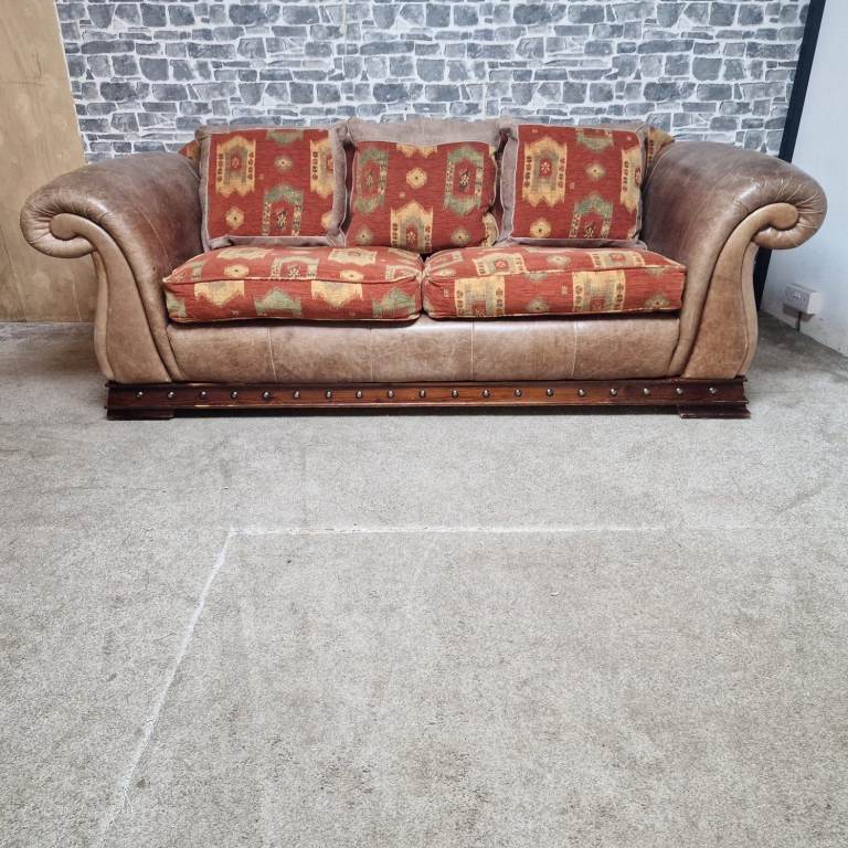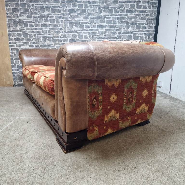 A substantial and very comfortable large 3/4 seater sofa with a classic, chunky design. Upholstered in a combination of leather-effect sides and patterned fabric cushions, giving it a warm, rustic look that suits both traditional and eclectic interiors.