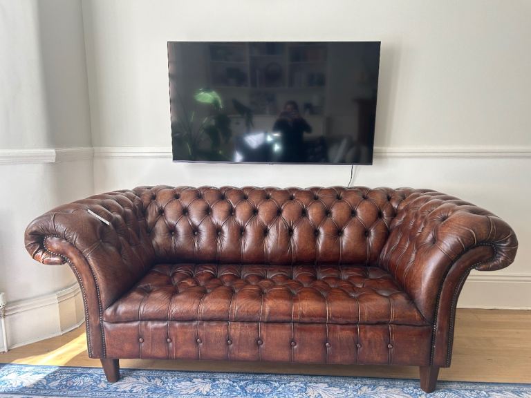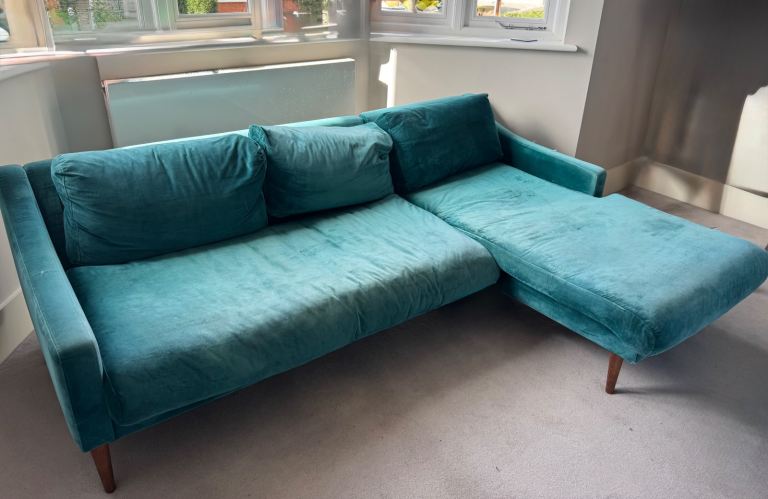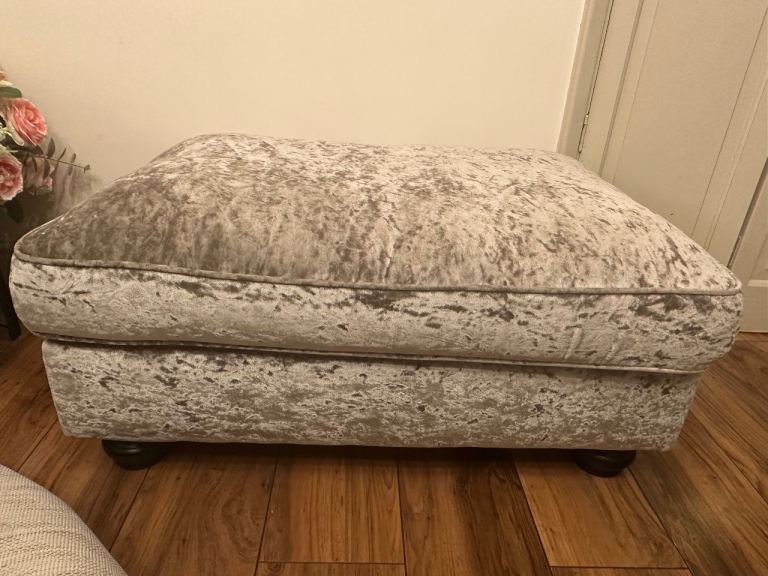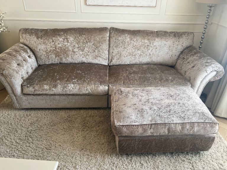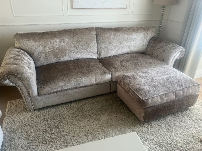 Large beige crushed velvet sofa and foot stool. Beautiful sofa. Excellent condition. No marks as it’s always been covered over.