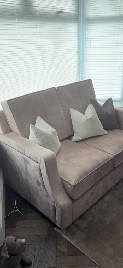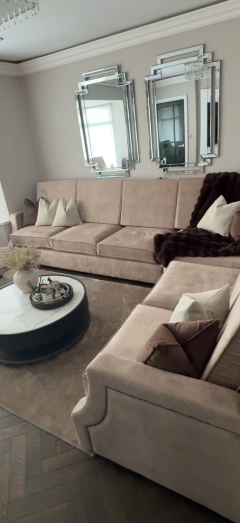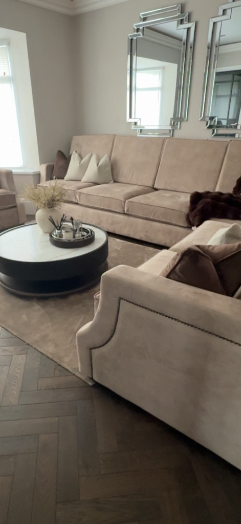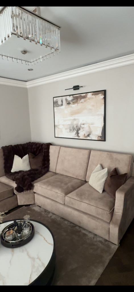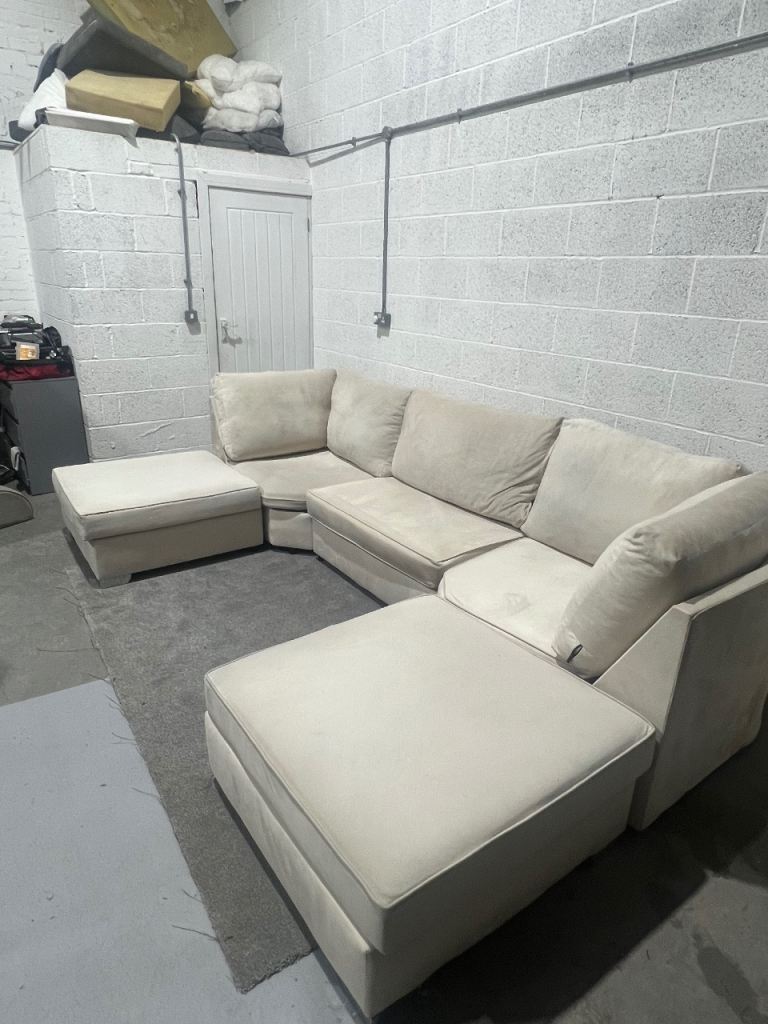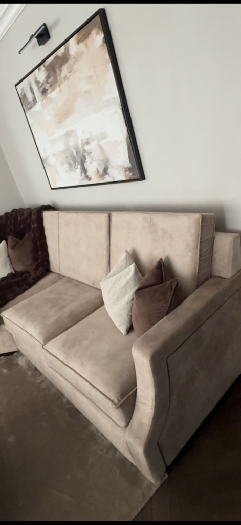 Selling a beautiful and very comfortable bespoke sofa set consisting of a large L-shape sofa and matching 2-seater. This was custom made, making it a 1 of 1 design, and finished in a neutral beige colour that suits most interiors.