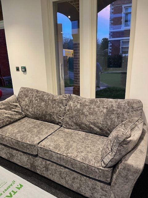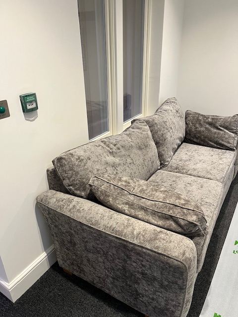 Large (2.2m) and very comfortable Next three seat sofa in grey crushed velvet. Reluctantly selling as it doesn’t fit in our new apartment.