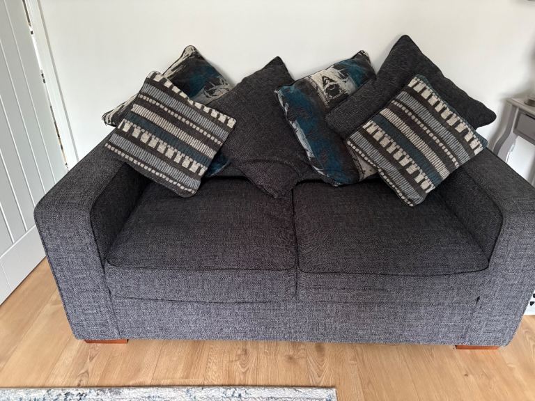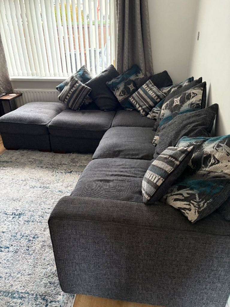 Large grey corner sofa with footstool and two seater sofa. Very comfortable suite. Smoke free and pet free home. Needs collected
