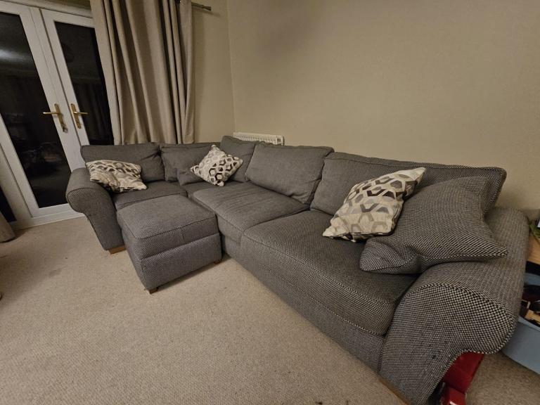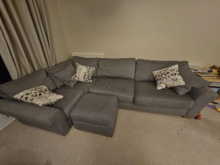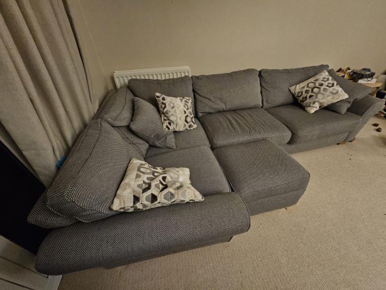 Very large grey corner sofa, originally from sofology. Deep and very comfortable, comes apart into two pieces for transport. Good used condition. Dimensions in the image. Also having matching armchair and ottoman pouffe if interested