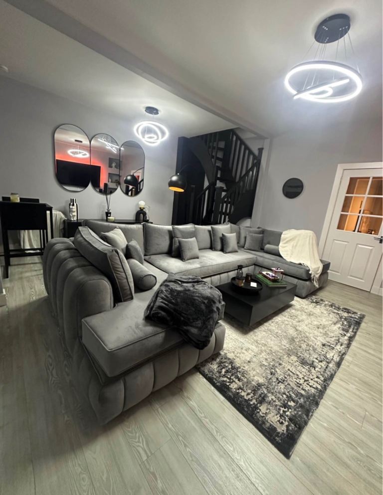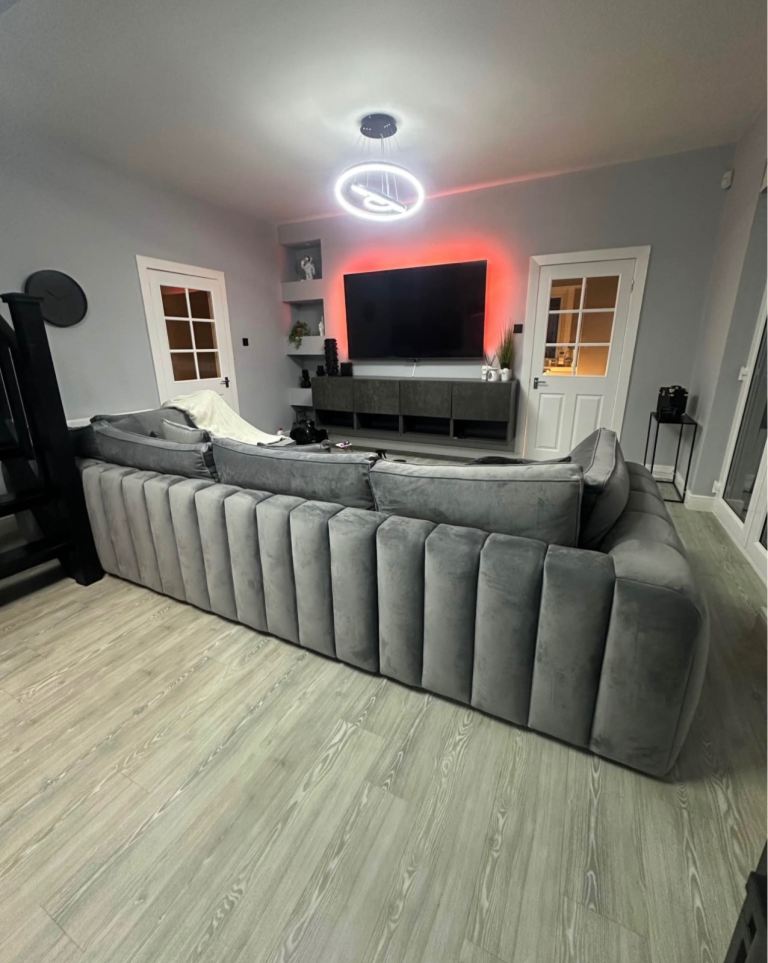 Large U shape grey plush velvet sofa bought from house of Chelsea