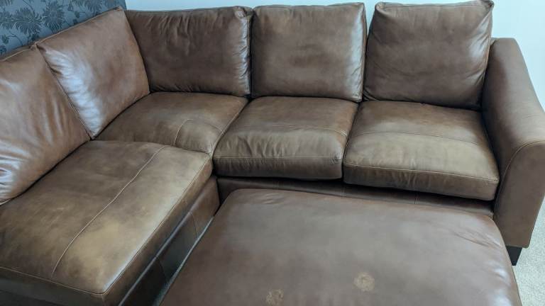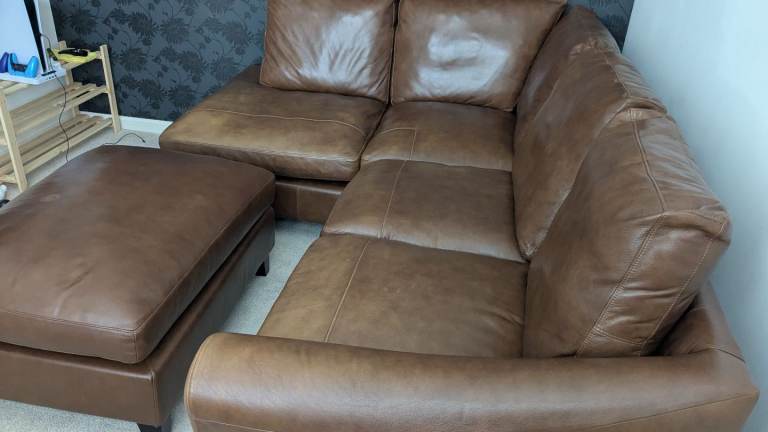 Laura Ashley baslow tan leather corner sofa and footstool measures 53 inches x 71 inches, footstool is 38 x 28 inches.