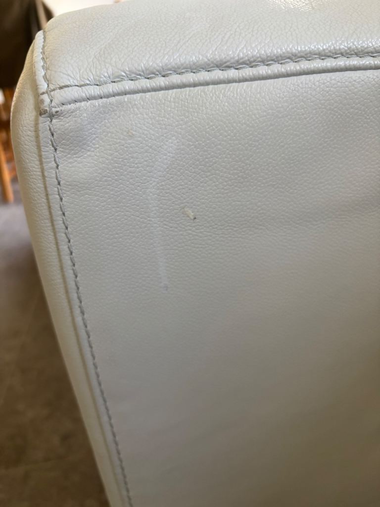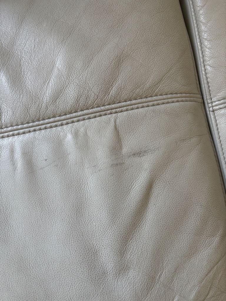 Light grey DFS 2 section leather sofa. Sofa has some general wear on the leather. Dimensions: Length 170cm, Height 70cm, Depth 90cm.