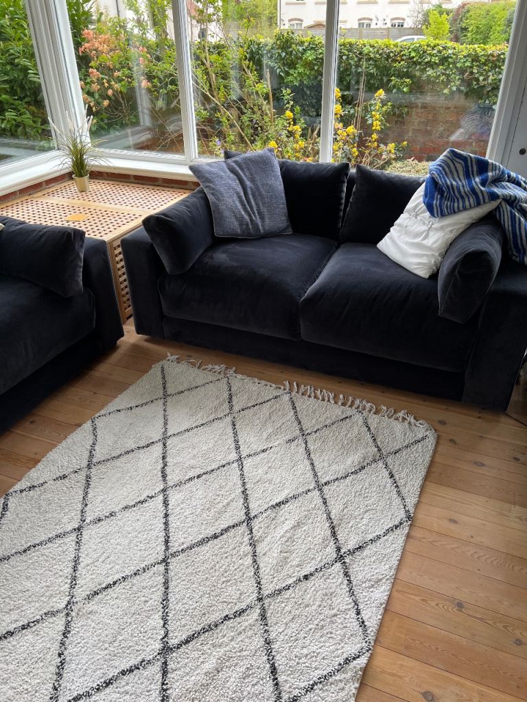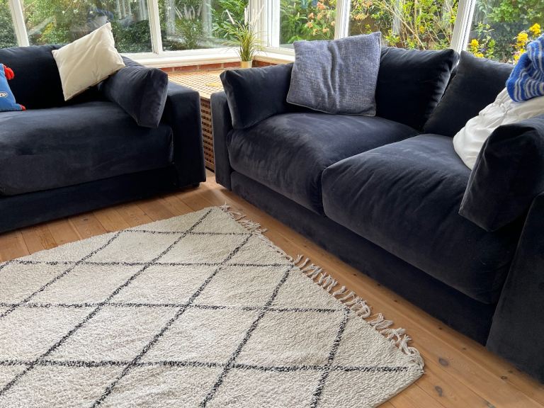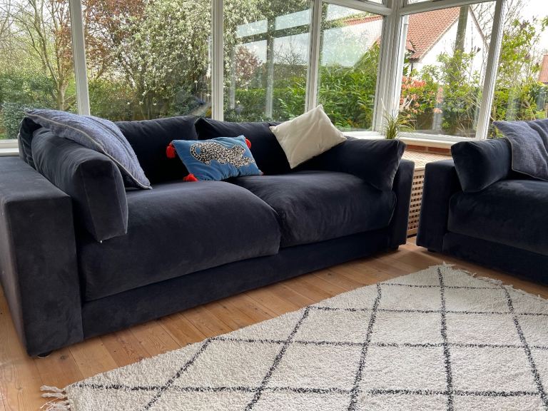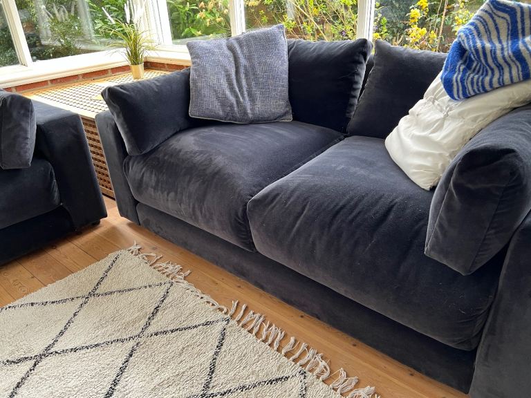 One large LOAF SOFA, seats four adults. One small LOAF SOFA seats three adults. In midnight blue clever velvet. Wonderfully soft fabric, super durable and spill resistant. 100,000 rub count. Perfect for busy homes. £800 for both. Can be sold separately. £450 for the large and £350 for the small. Must be picked up by the buyer.