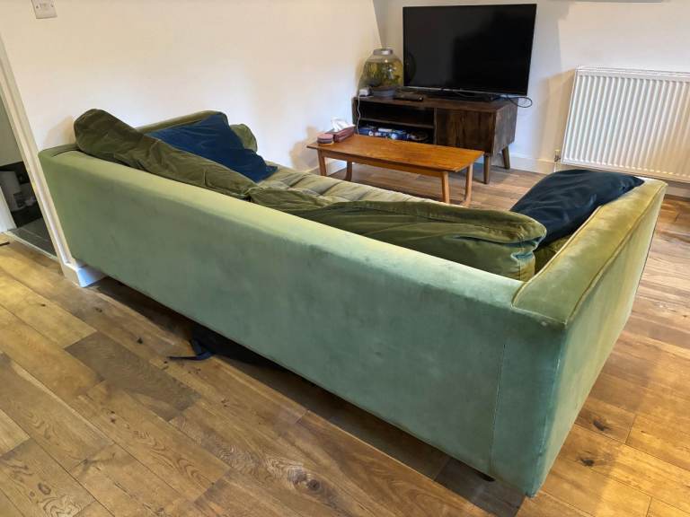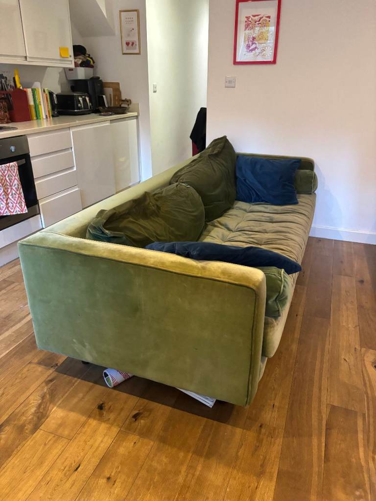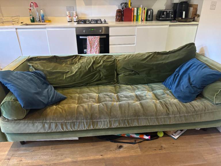 The velvet is a bit faded on the sitting areas and back cushions but apart from that in good used condition. Really comfortable and large sofa that can be used as a single bed for guests too.