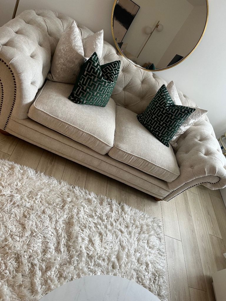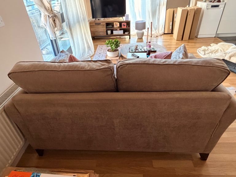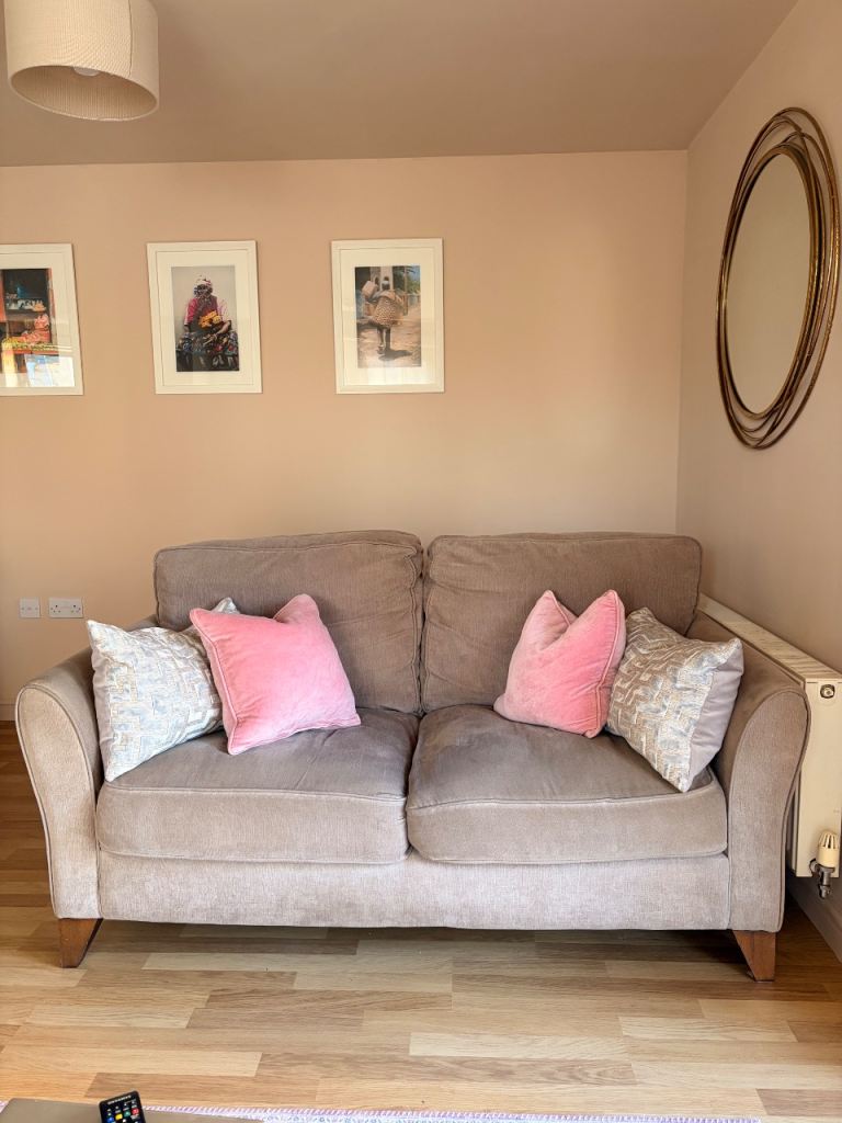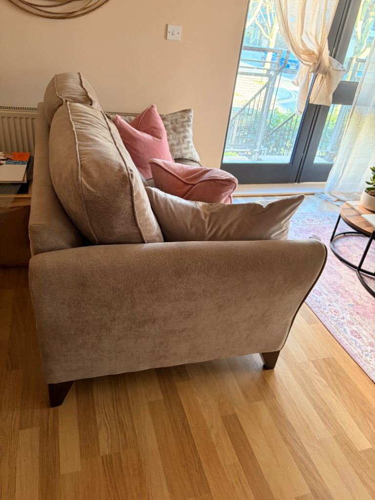 Stylish and comfortable 2-seater sofa in a versatile neutral beige/taupe fabric, perfect for modern or classic interiors. Features soft, supportive cushions and sturdy wooden legs for a clean, contemporary look.