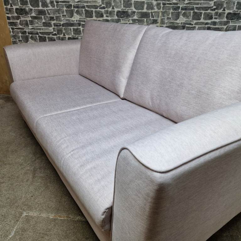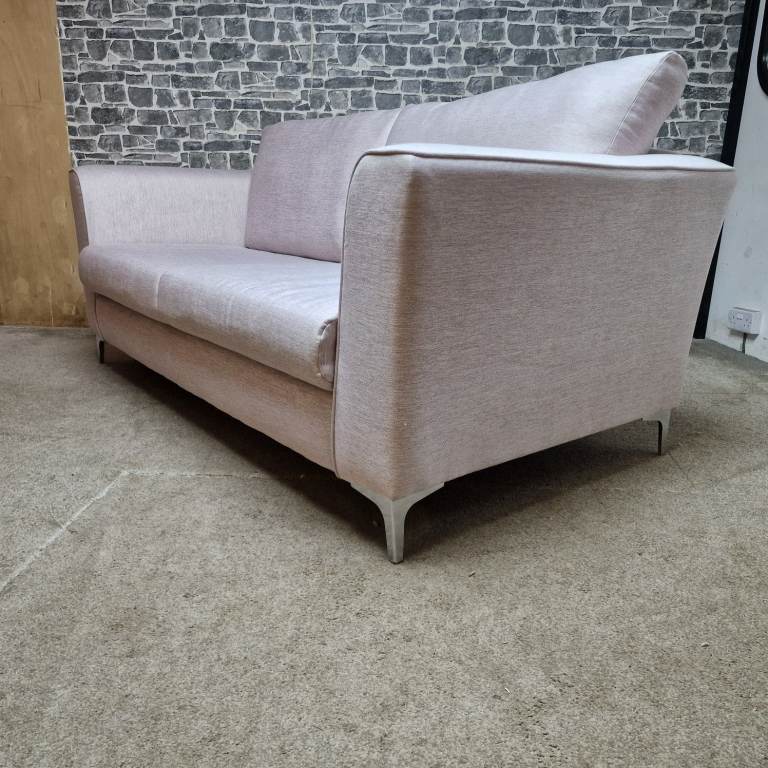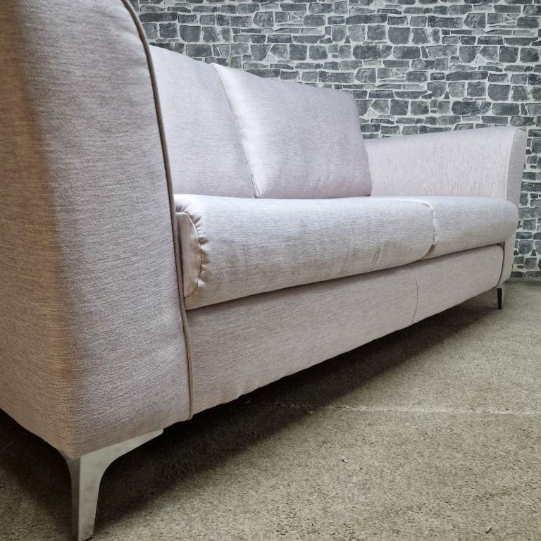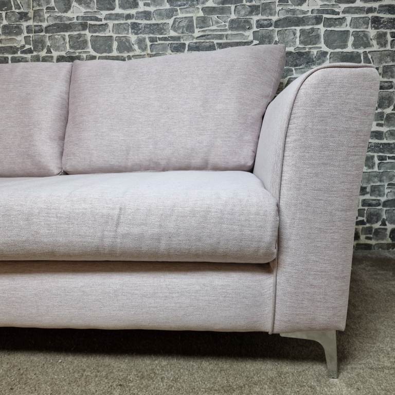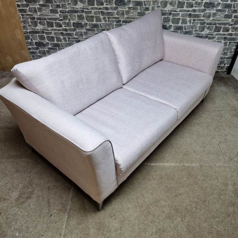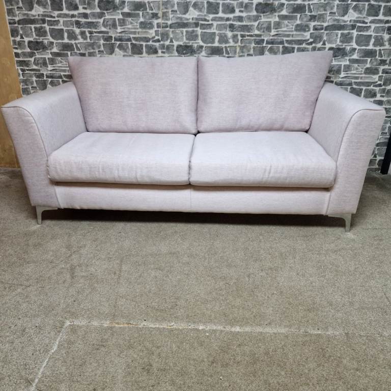 A stylish modern sofa in a very light pink fabric, featuring sleek lines, plush seat cushions and supportive back cushions. It sits on contemporary metal legs, giving it a clean and elegant look. It’s in excellent condition with minimal signs of use and comes with its fire label attached. Dimensions: L 192 x D 92 x H 72 cm