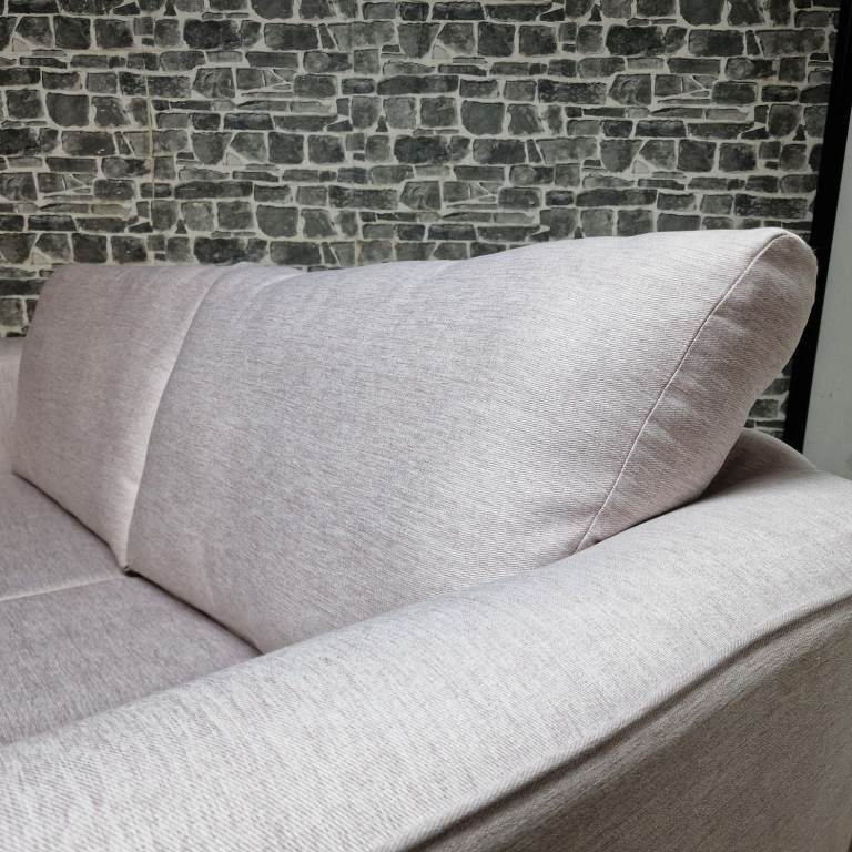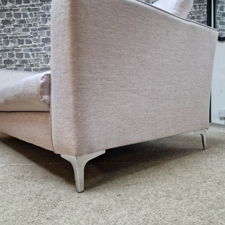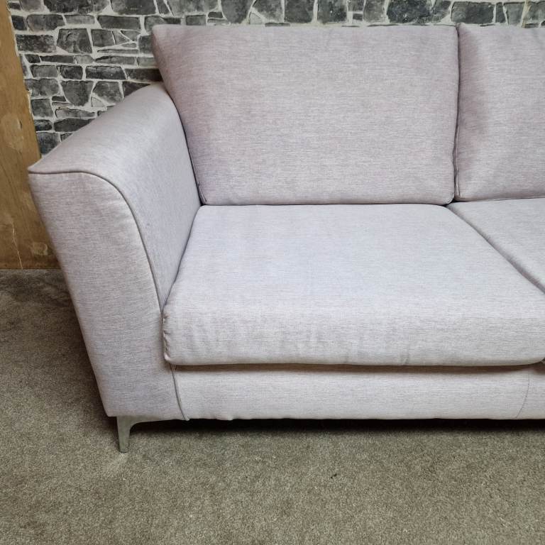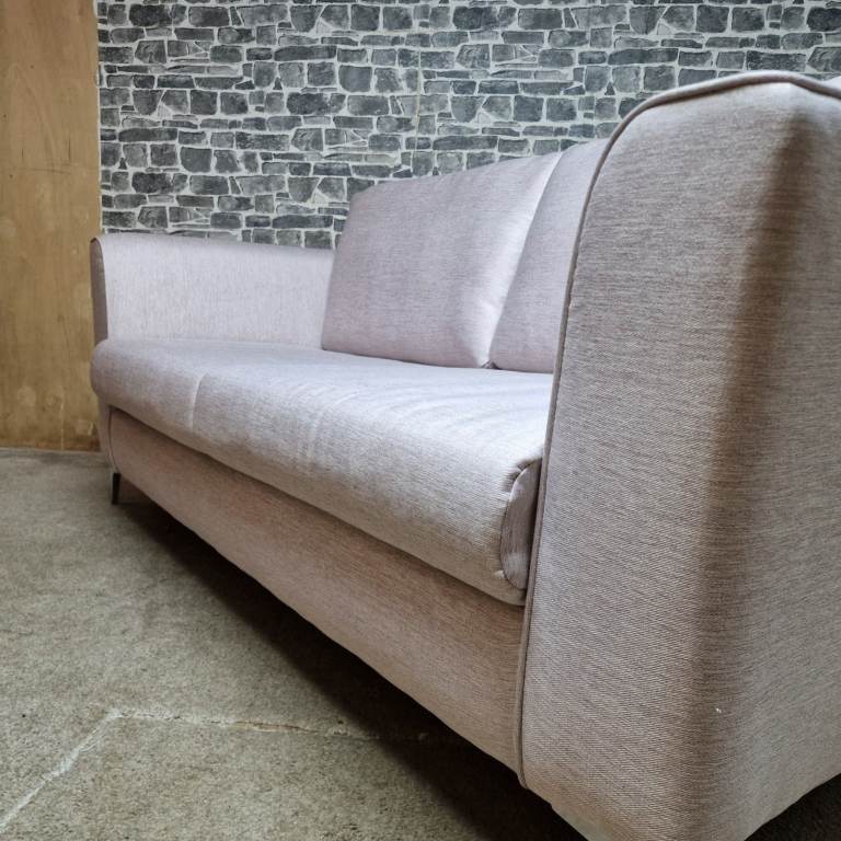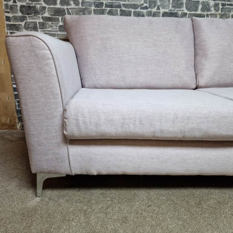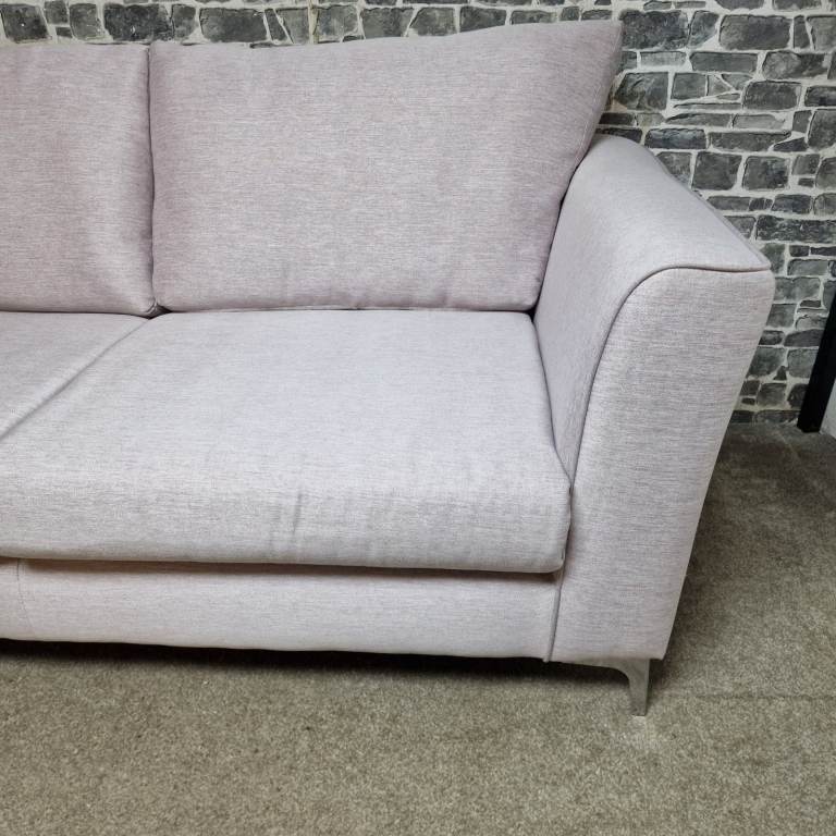 A stylish modern sofa in a very light pink fabric, featuring sleek lines, plush seat cushions and supportive back cushions. It sits on contemporary metal legs, giving it a clean and elegant look. It’s in excellent condition with minimal signs of use and comes with its fire label attached. Dimensions: L 192 x D 92 x H 72 cm