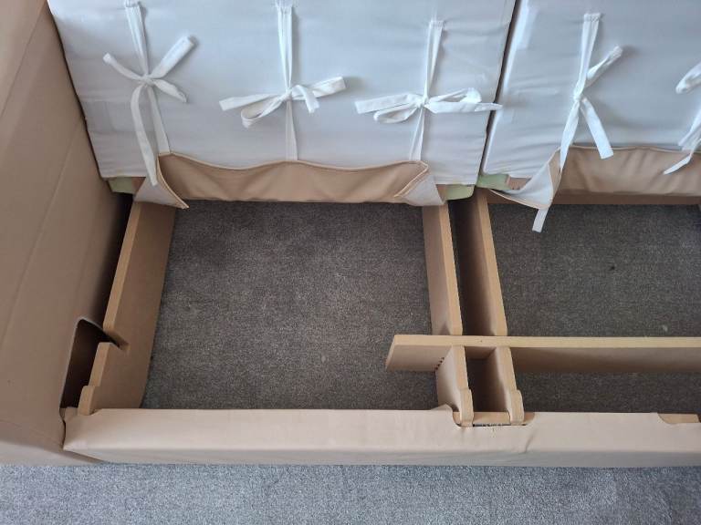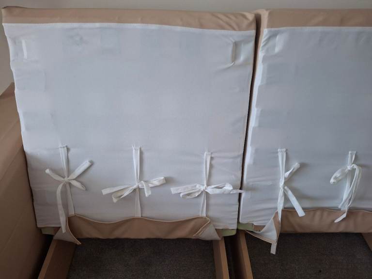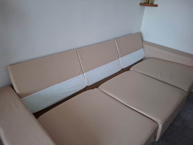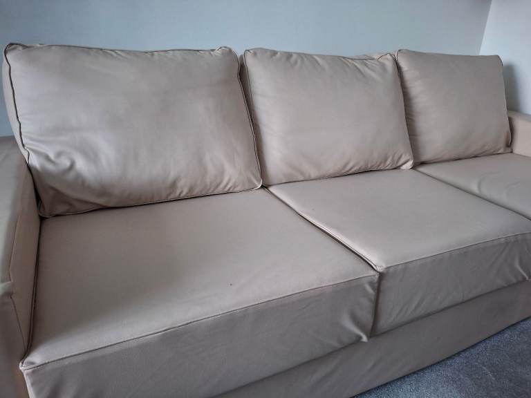 Cream faux leather 3 seater sofa. Contemporary modular (self-assembly), width 230 cm, depth 93 cm. Excellent condition, no marks, scratches etc although there is some creasing to the covers which can clearly be seen in the photos. Assembly is straightforward and requires no special tools, assembly instructions included. Bought for £850 two years ago, asking £250 but sensible offers welcome. Collection only. PLEASE NOTE, SOFA HAS ALREADY BEEN DISASSEMBLED TO MAKE ROOM FOR NEW SOFA.