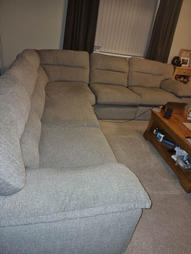 Morgan corner sofa from oak furniture land 6 months old paid £1900 like new hardly used colour taupe fabric excellent condition any viewing welcome. Will sell for £800