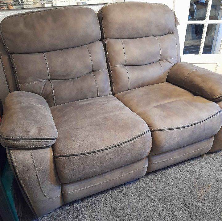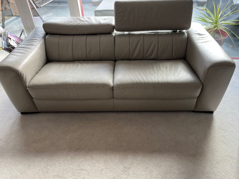Mid grey leather sofa with adjustable headrests.