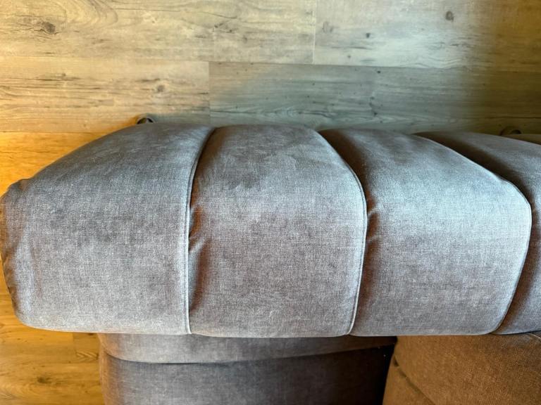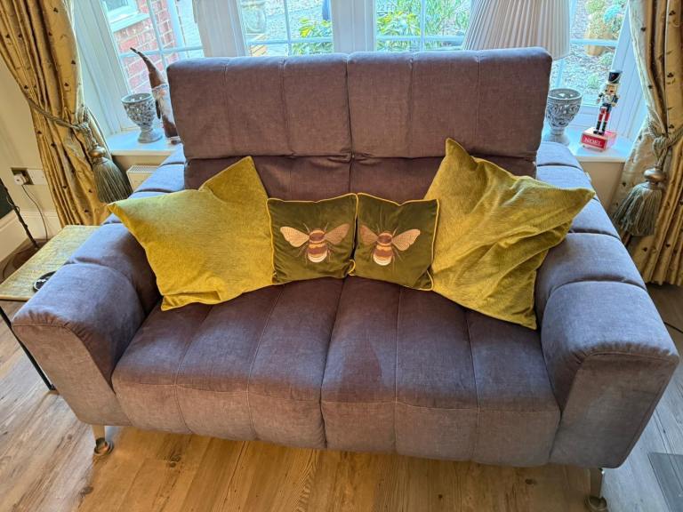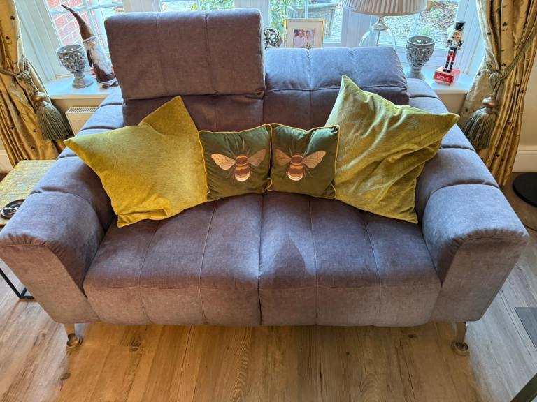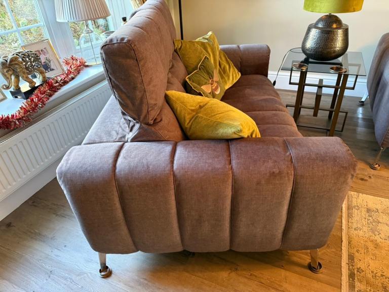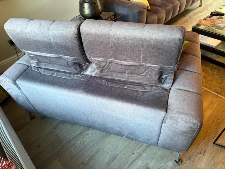 Natuzzi two seater sofa with multiple position adjustable headrest in truffle colour with chrome legs.