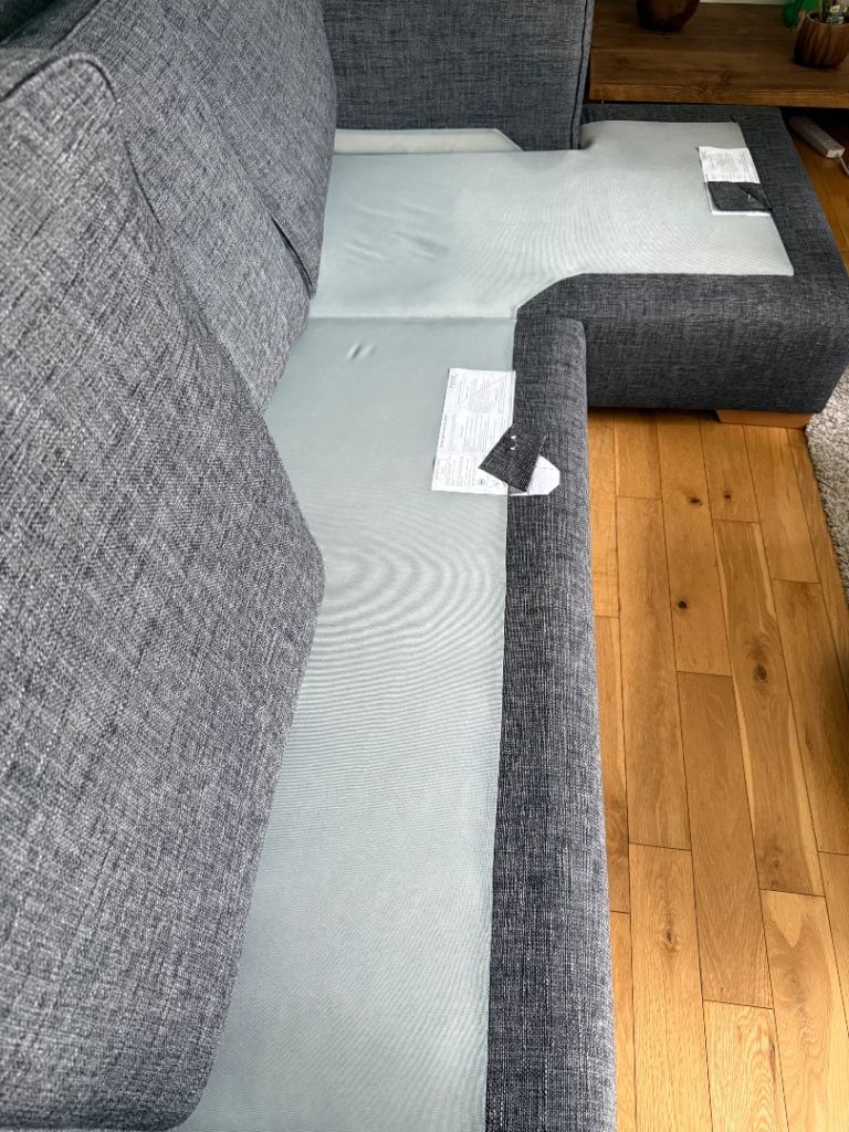 Ideal for a living room refresh, plenty of life left in it. 260 cm length 145 depth at chaise, and 93 cm for other two seats, 98 cm height