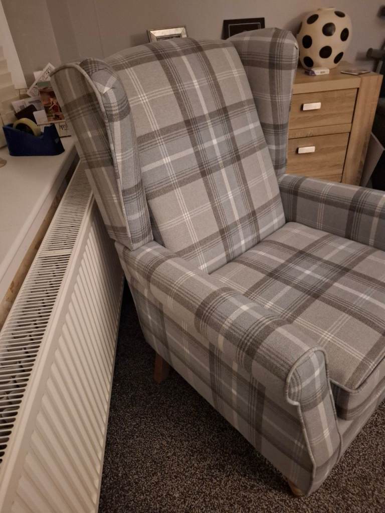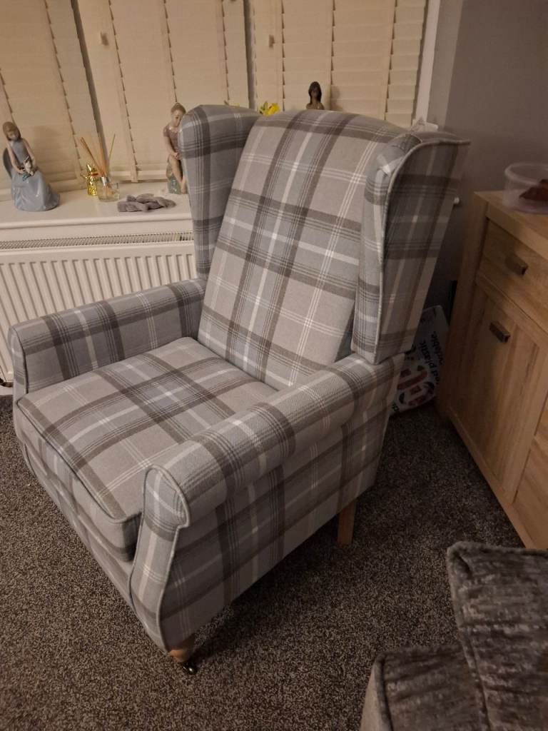 Brand new grey checked winged back armchair bought from Dunelm. Only had few weeks. You can still purchase and view on their website. Genuine reason for sale. Perfect condition.