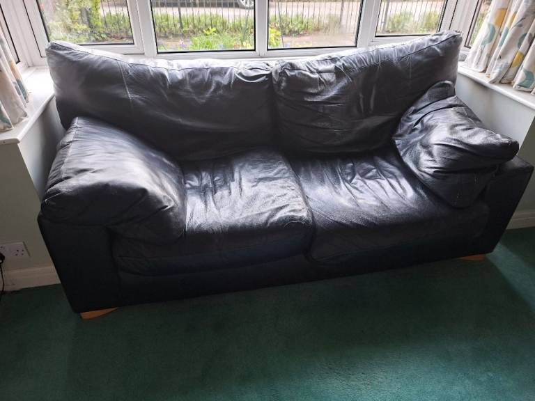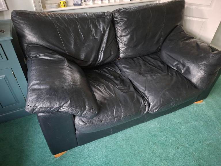 Two black leather settees with pale wood legs. Both have loose seat, back and arm cushions. Very comfortable.