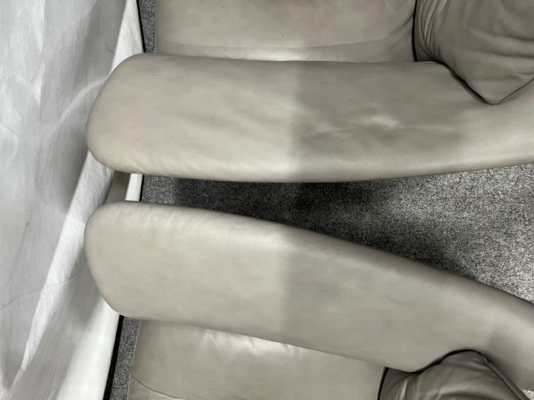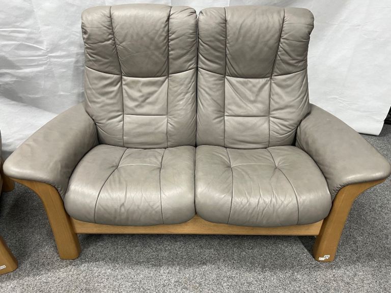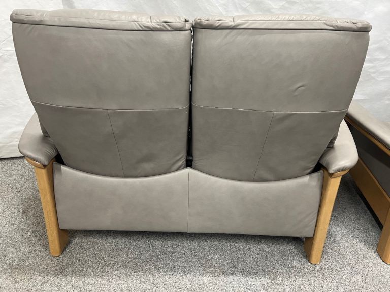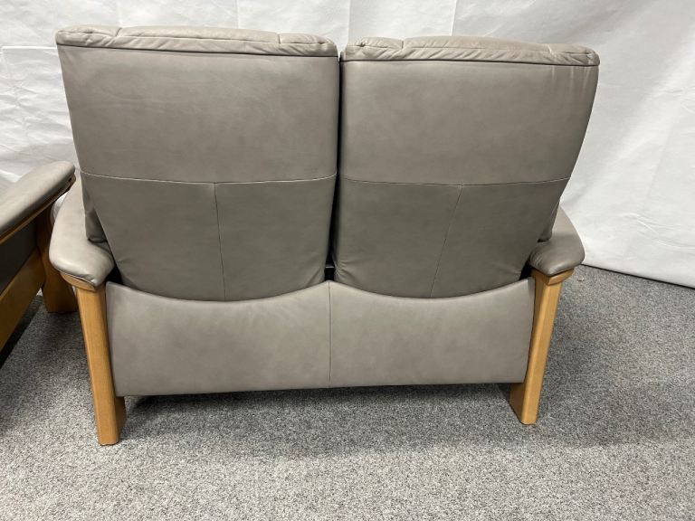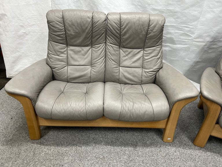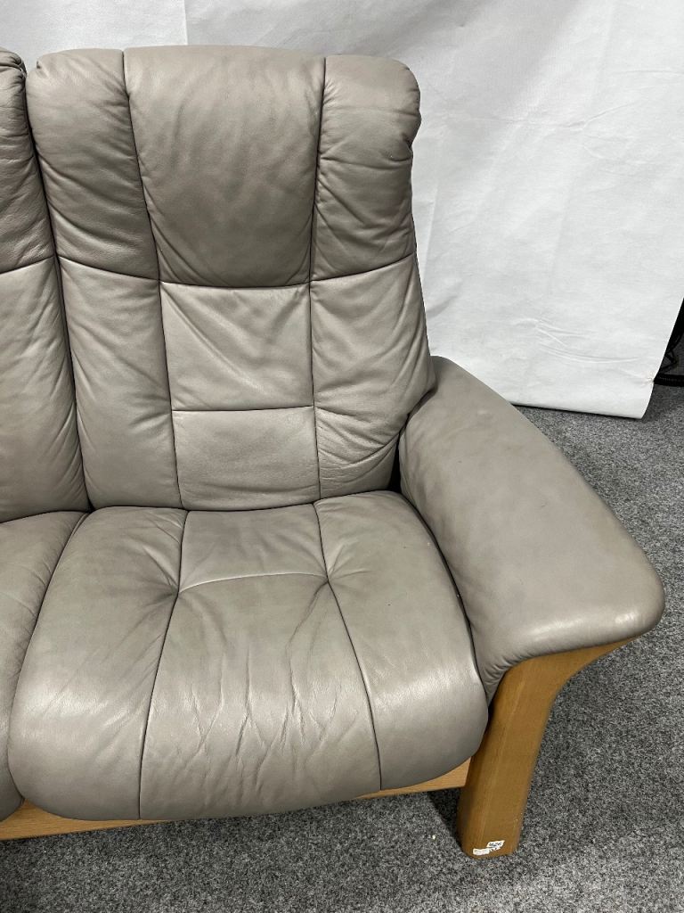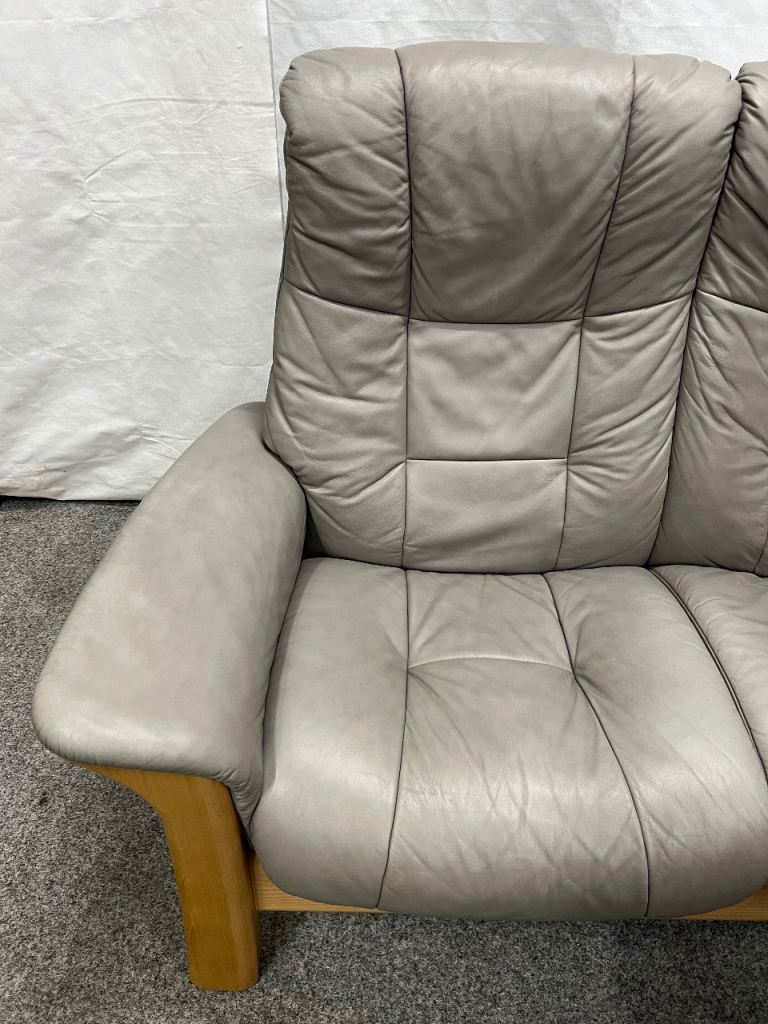Pair of Quality Ekornes Stressless 2 seater Windsor recliner sofas in Silver grey coloured soft Paloma leather from a smoke free home with minor signs of use normal with well looked after furniture (1625)